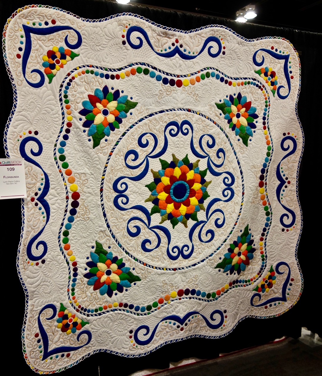 Lynn Peck-Collins entered Floribunda (85" x 85") in the Paducah quilt show in 2017. It was displayed in the Large Quilts - Stationary Machine Quilted category. Wikipedia says the meaning of Floribunda is: