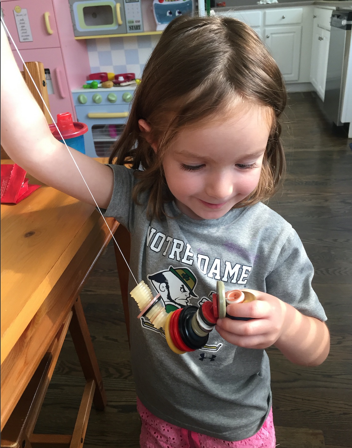 My granddaughter is 3 1/2, but lives in Denver and I live in the Chicago area, so I can't teach her to sew yet. I just sent her a Ziploc bag of large buttons from my late mother's button box and some threader floss (like for those who have a bridge.) Amy said she strung buttons for hours! It's a start!