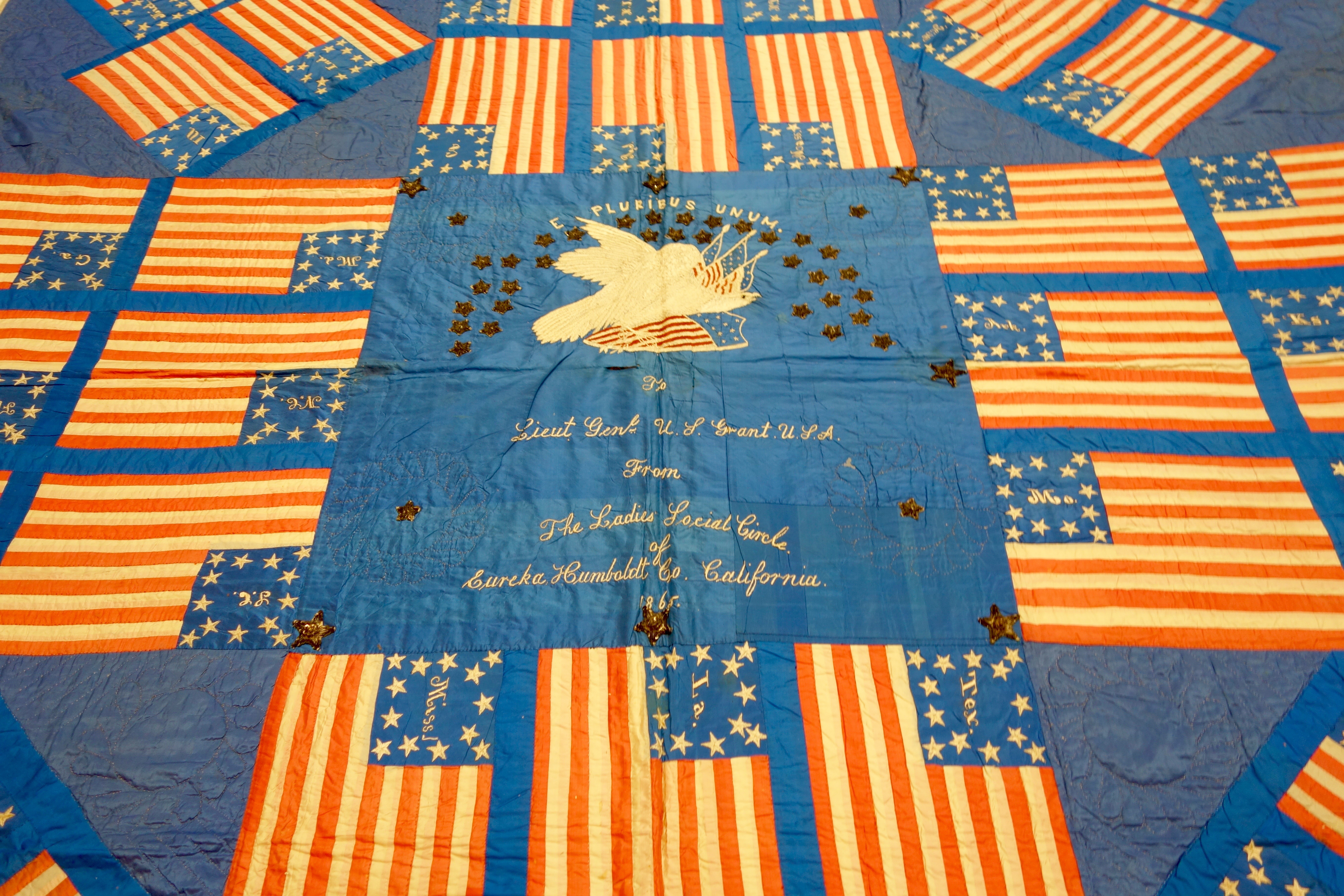 In 1865, the Ladies Social Circle of Eureka, Humboldt Co., California dedicated a quilt to Lieutenant General Ulysses S. Grant. It was auctioned off at the sanitary fair to raise funds to assist the Union troops through the sanitary commission.The Civil War ended shortly after this date. The Ladies Social Circle dedicated the banner quilt to Ulysses S. Grant honoring his stay at Fort Humboldt.
