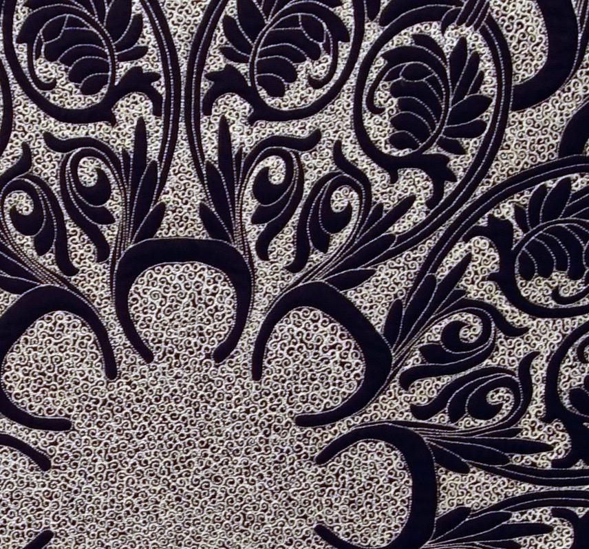 Ximo won both 1st Place and 3rd Place in the Merit Quilting - Stationary Machine Category sponsored by BERNINA at Houston 2016. This piece, called Little by Little, is an amazing display of quilting. As you can see, the answer to the question is "Yes, it's thread. This is a whole-cloth blue quilt, with quilting making the design." Fantastic!