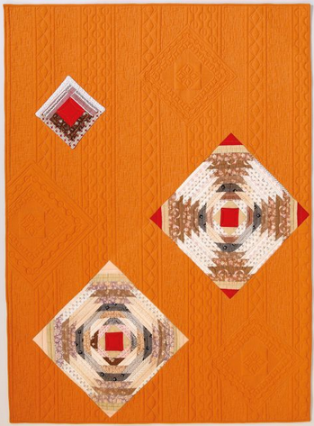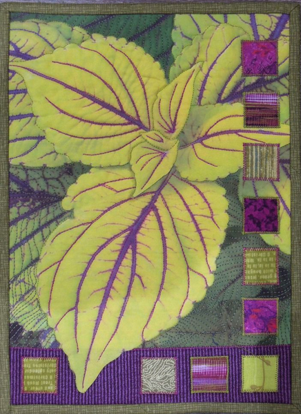 This informal arrangement involves the use of several smaller elements to balance out the one larger. While it may appear easy, it requires the artist pay close attention so that some elements don't look as though they are falling off the page. In Coleus 2 the small squares along the side and bottom balance out the large Coleus leaf. In Ojo de Dios quilt (on the right) notice how she included two sizes of quilted blocks to balance out the three actual pieced blocks.