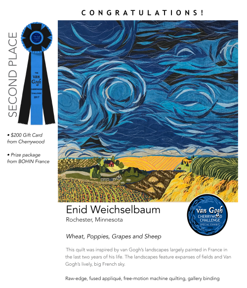 The winners of the Cherrywood "Van Gogh" Challenge have been announced and they are spectacular. Here we show 1st, 2nd, and 3rd place. To see more winners, and to learn more about the challenge and the TWO travelling exhibits, click on See The Quilts. The next Cherrywood challenge will be announced at the Houston International Quilt Festival.