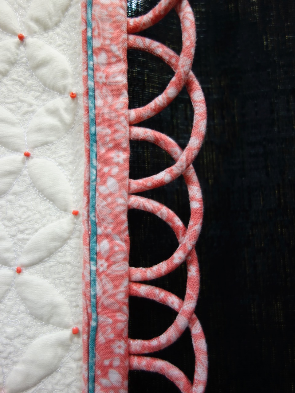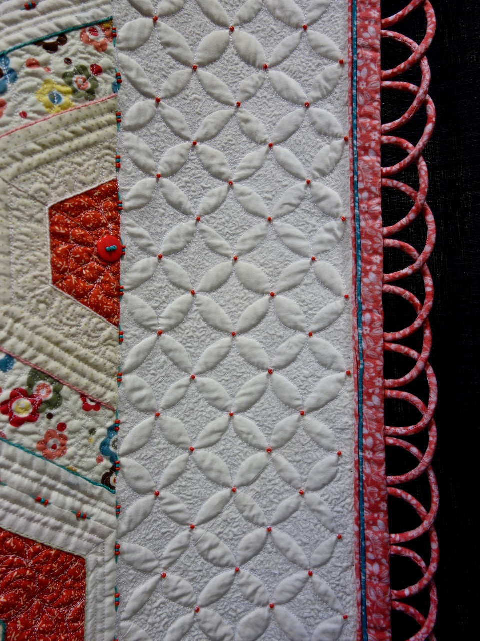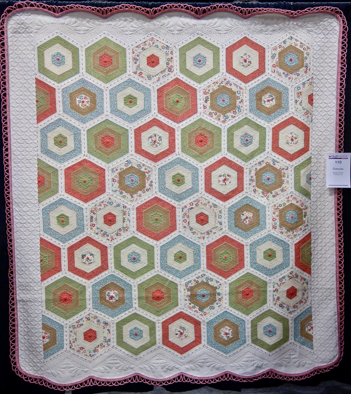 Marilyn Smith of Columbia, Missouri, USA created the quilt Carolina, 84" x 94". It was accepted into AQS Paducah 2017. This is one of those quilts you have to linger on for awhile to understand the work involved. We love the border and the extra details throughout the quilt. It's interesting how she scalloped two of the edges. See how the quilting is such an important part of the design. The techniques include Beading, Bias Work, Hand Embroidery, Free-Motion Quilting, Machine Piecing, and Piped Edging.