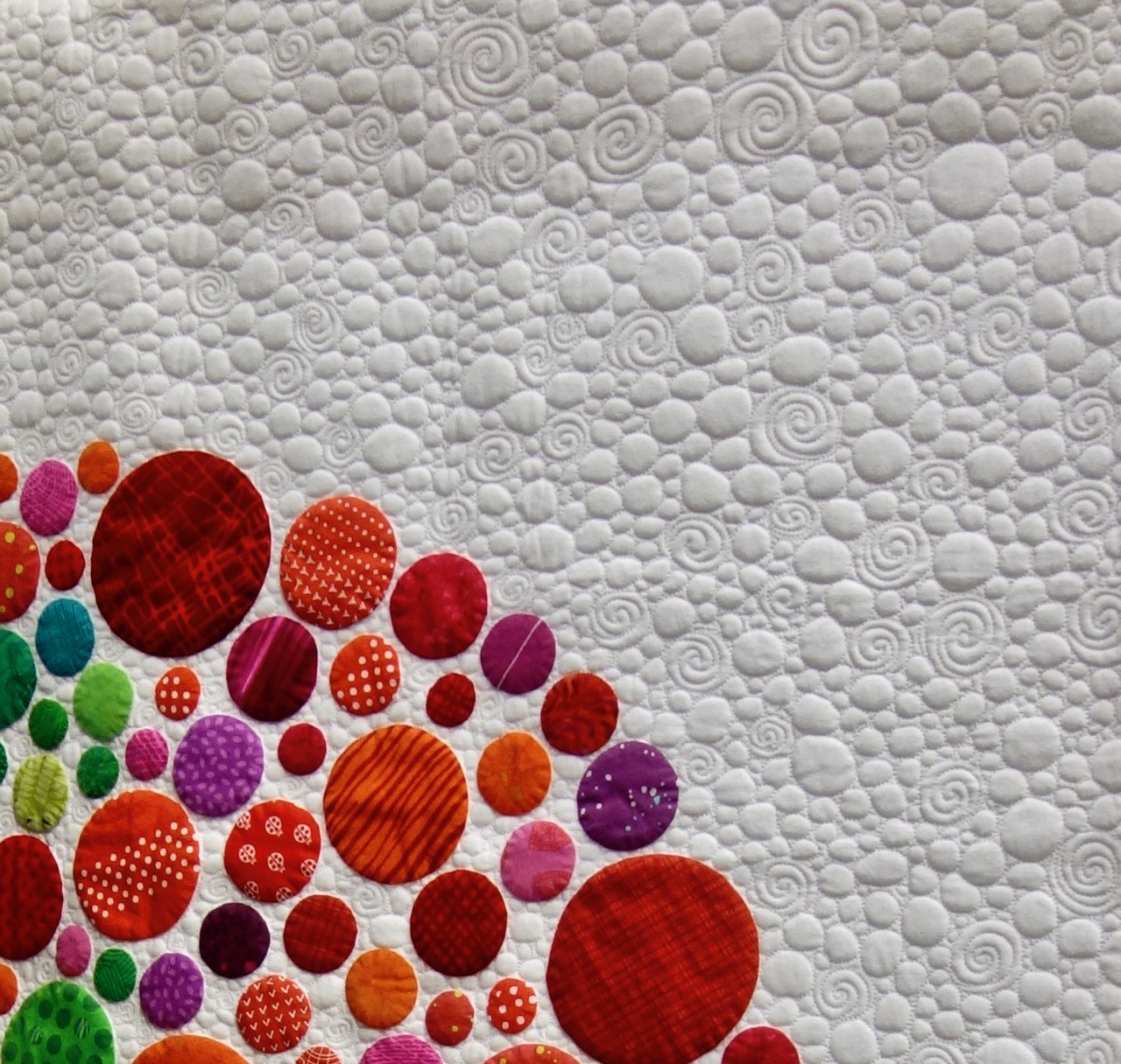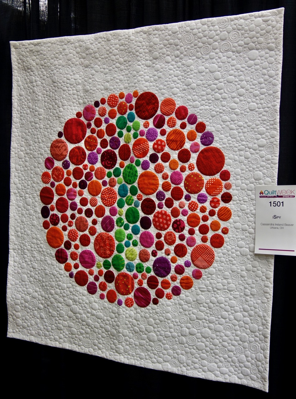 Cassandra Ireland Beaver won 1st Place two years in a row with her straight-line quilting. So what did she do next? How about "No Straight-Line Quilting." This quilt, titled iSpy, is 44" x 48" and was entered in the Small Wall Quilts - Quilters Choice category at AQS Paducah Spring 2017. The quilt is square, but I didn't see any other straight lines.