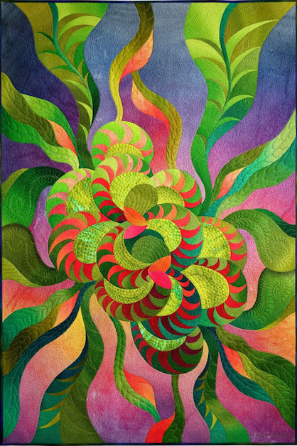 Once you get the hang of that, you can then manipulate the lines (pieced or not) into larger shapes as I have done here in Aztecian. Aztecian features a controled palette of hi-contrast colors pieced into repeating lines. The lines change directions creating movement and interest in the quilt.