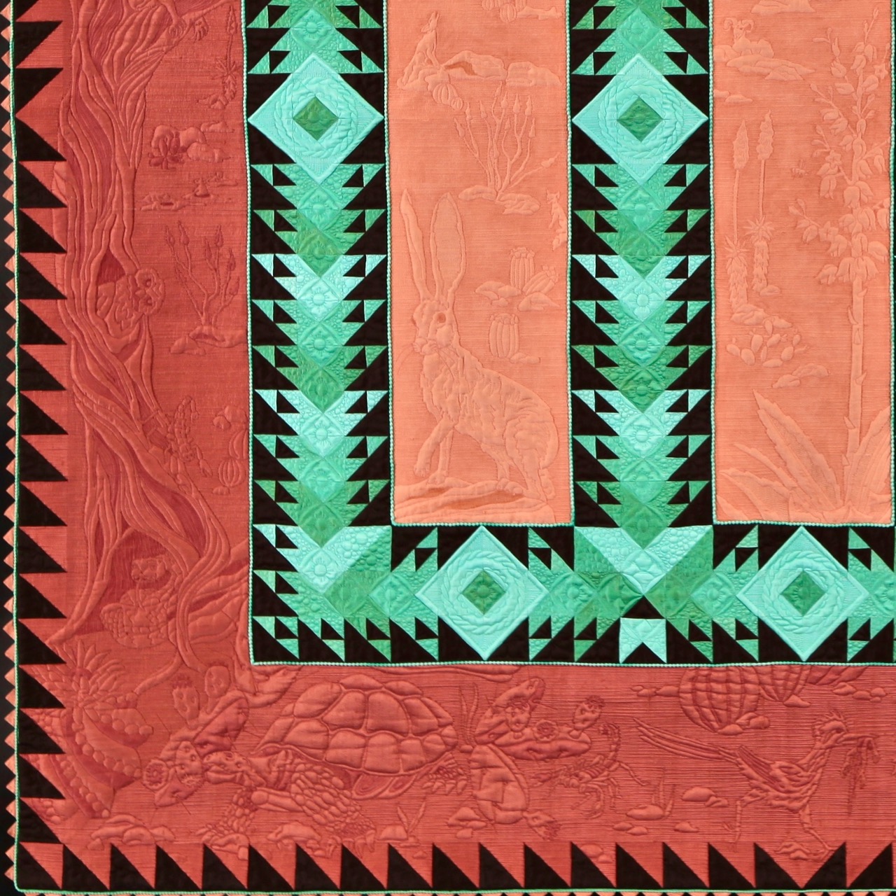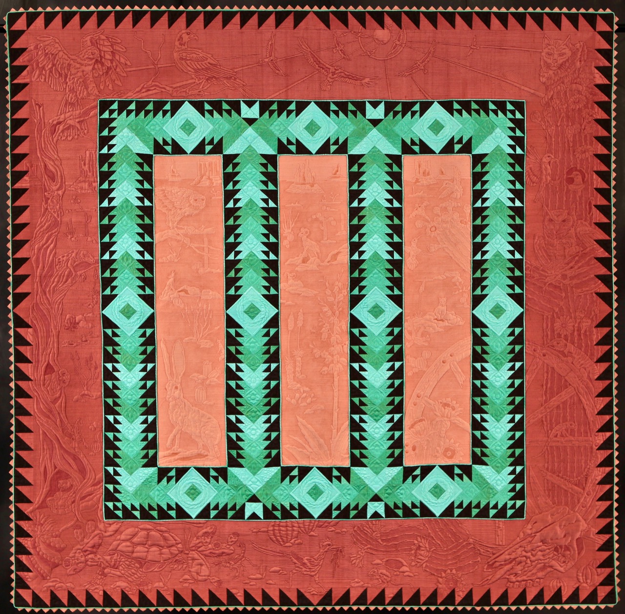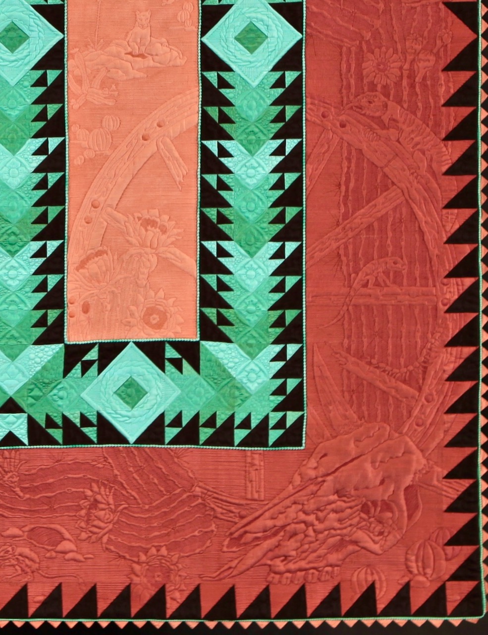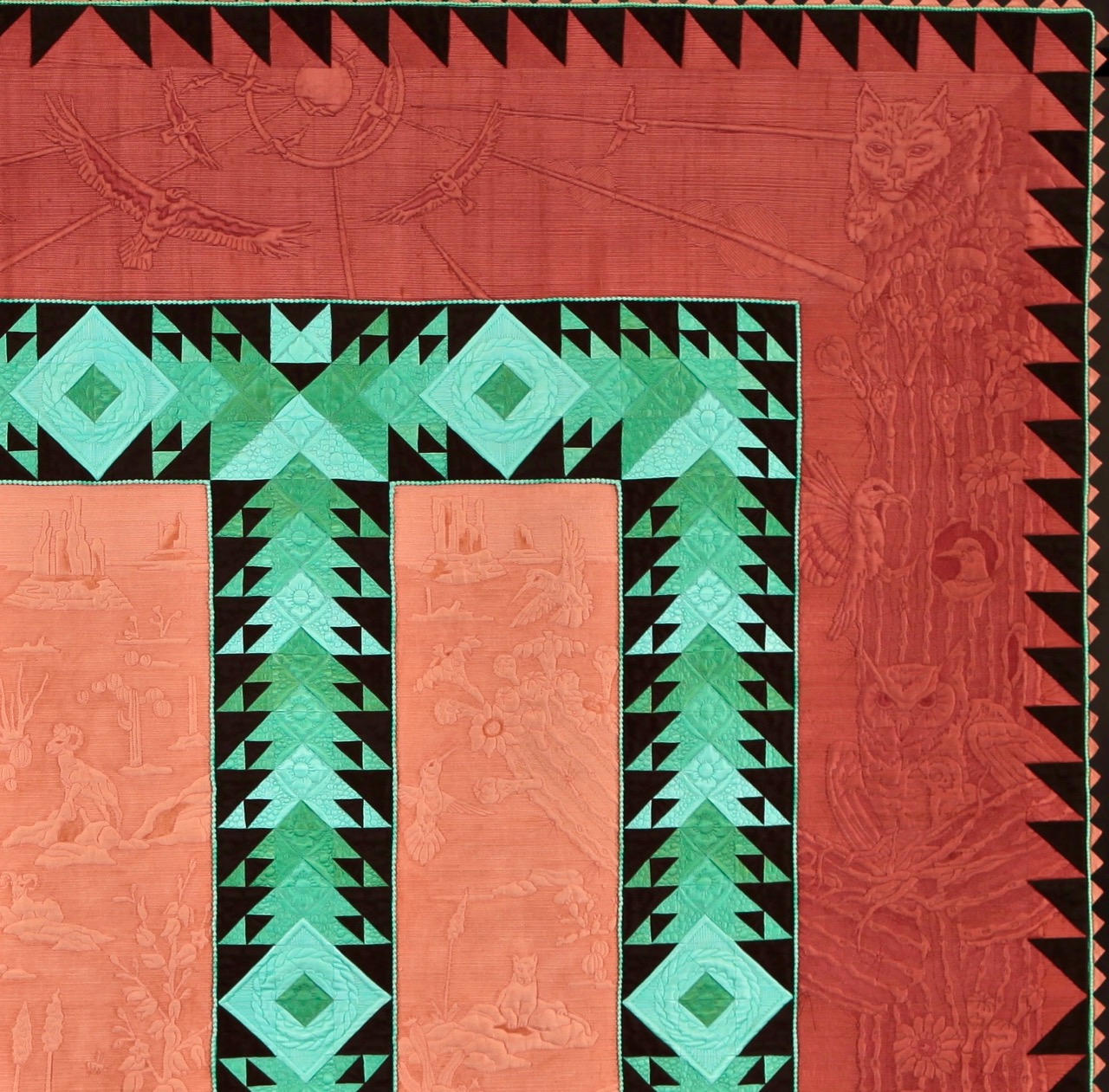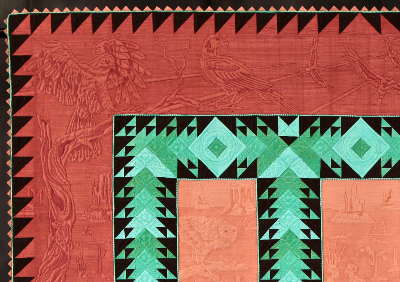 Bethanne Nemesh won 1st Place in the Large Quilts: Quilting is the Star category at Fall Paducah 2017 with her quilt, Into the Westward Sun. Take a closer look at the pictures and then go to the bottom to see her interview with Bonnie Browning. You can learn her techniques in Show 2107: Extraordinary Binding Techniques & Amazing Fabric Collage which just premiered this week. Take note of the special beading in the border. Star members can watch now. Not a Star Member?