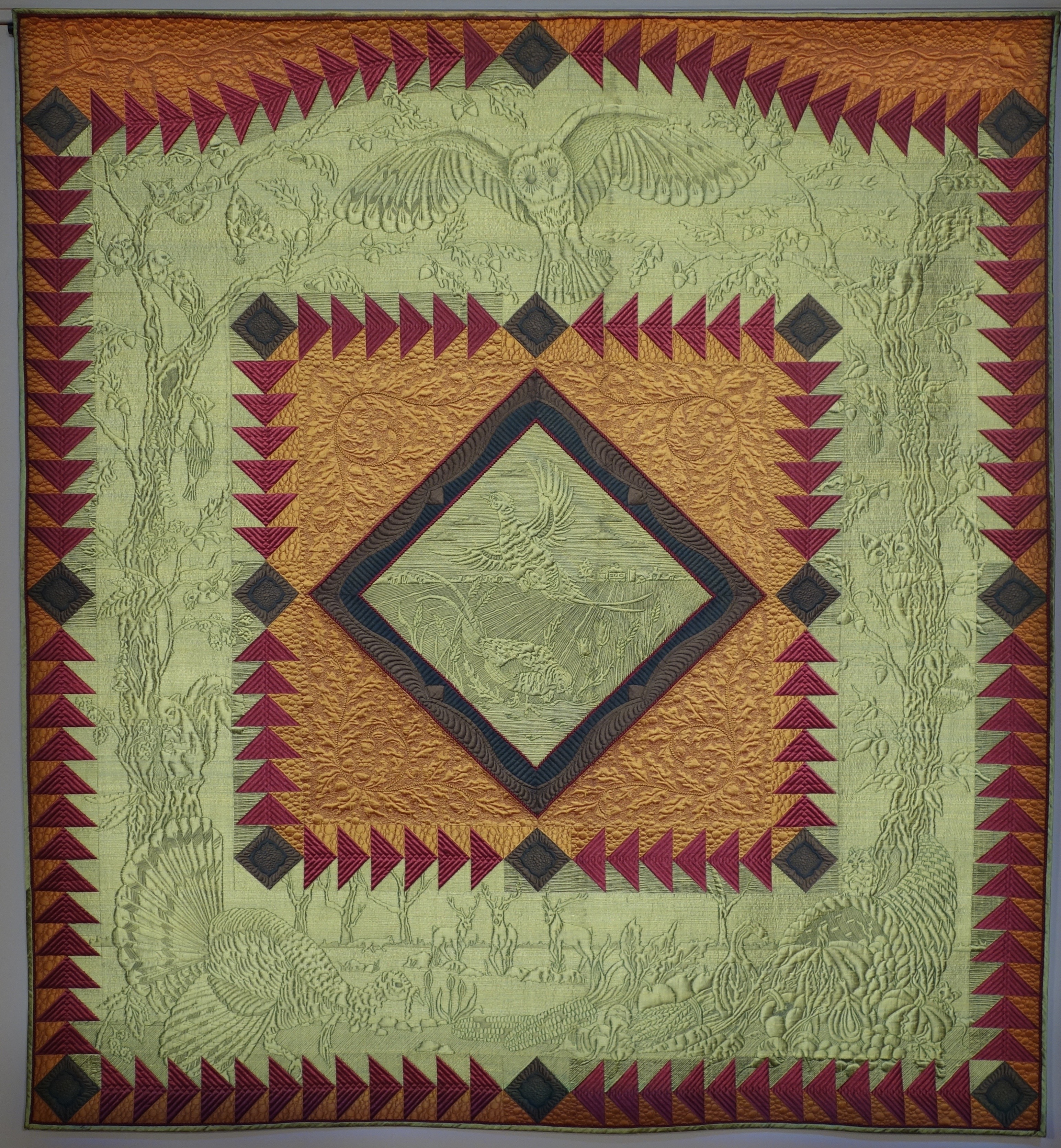 This is the third in a series of silk dupioni quilts done in my pictographic quilting style. I love everything about a Pennsylvania fall ... the colors, the smells, the harvest and all the busy critters. With this quilt, I tried to capture that feeling using all original hand drawn motifs that are free-motion quilted. The beaded details are tiny applique tubes individually stuffed with beads and hand tied off. The center medallion and binding feature handmade beaded piping. Derwent Inktese pencils were used on parts of the quilt to create shading.
