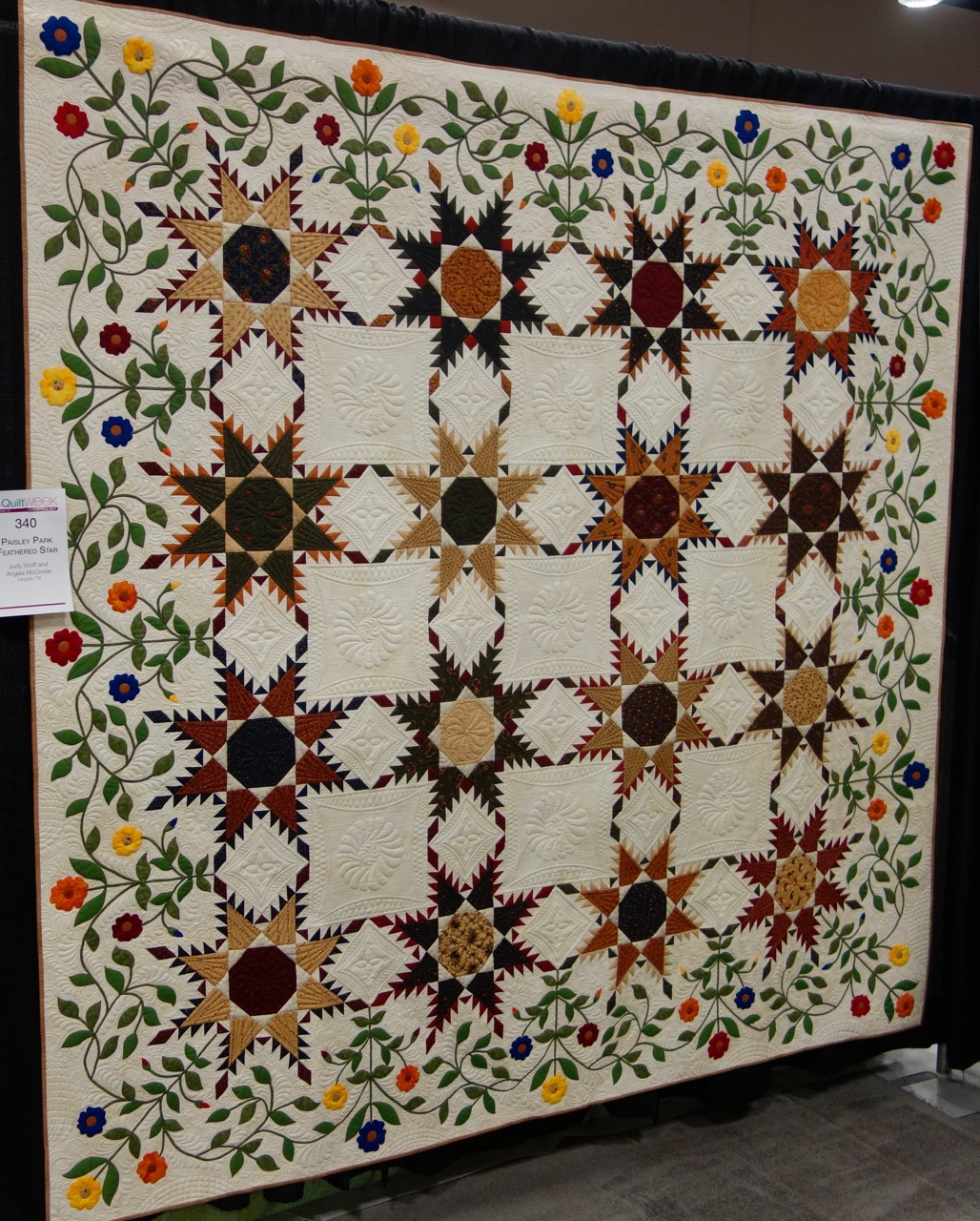 Fused Appliqué, Machine Appliqué, Free-Motion Quilting, and Machine Piecing are all used in this wonderful traditional quilt. Judy Wolff and Angela McCorkle created Paisley Park Feathered Star, 89" x 89," and it was accepted at AQS QuiltWeek Spring Paducah 2017. We love the pieced points, the flowing appliqué, and the use of a white fabric mixed with swirls of light brown to blend with the colors in the quilt. Are you a fan of Traditional Quilts? Here is a great example.