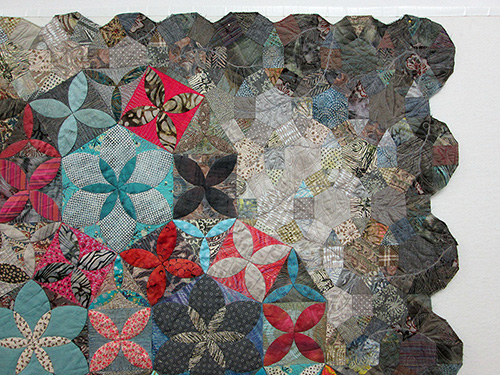 We are pretty sure the the blocks are appliquéd. As far as putting the quilt blocks together, Karen is an expert at English Paper Piecing, so we think she might have sewn the blocks together using that method. Take a look at the bottom picture. What do you think?