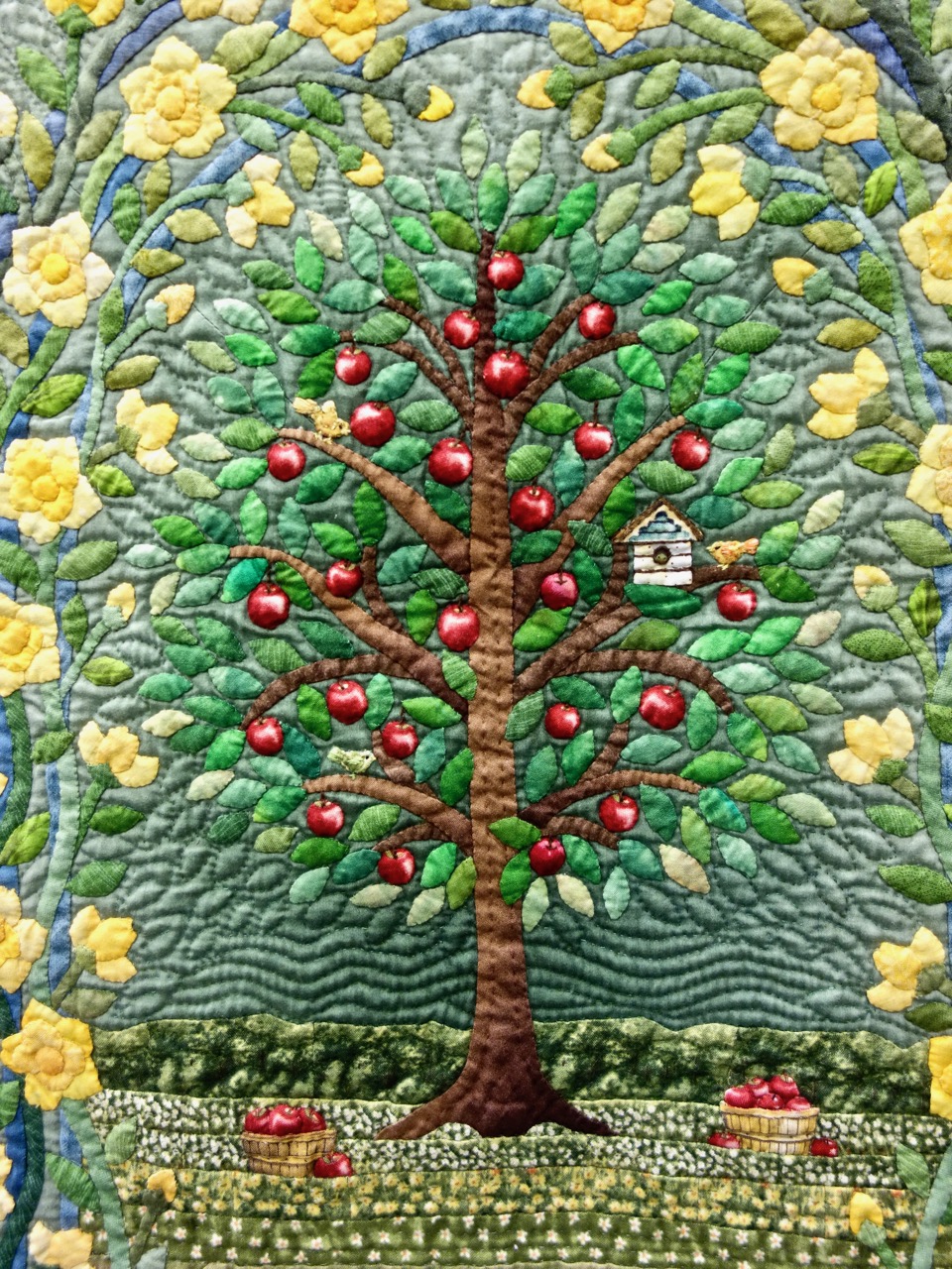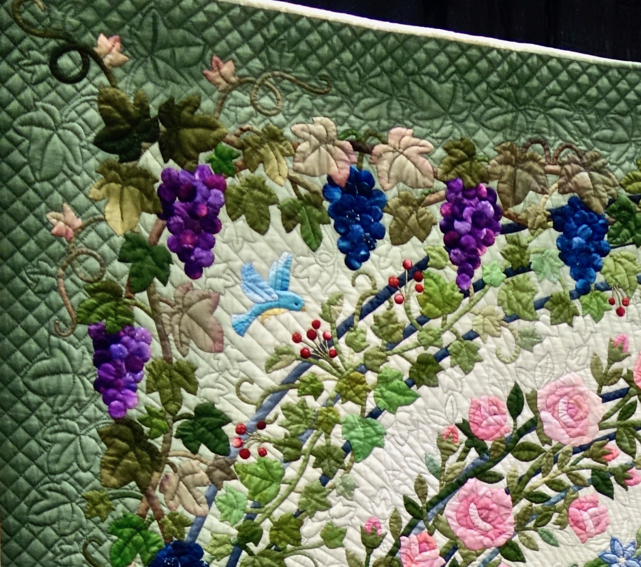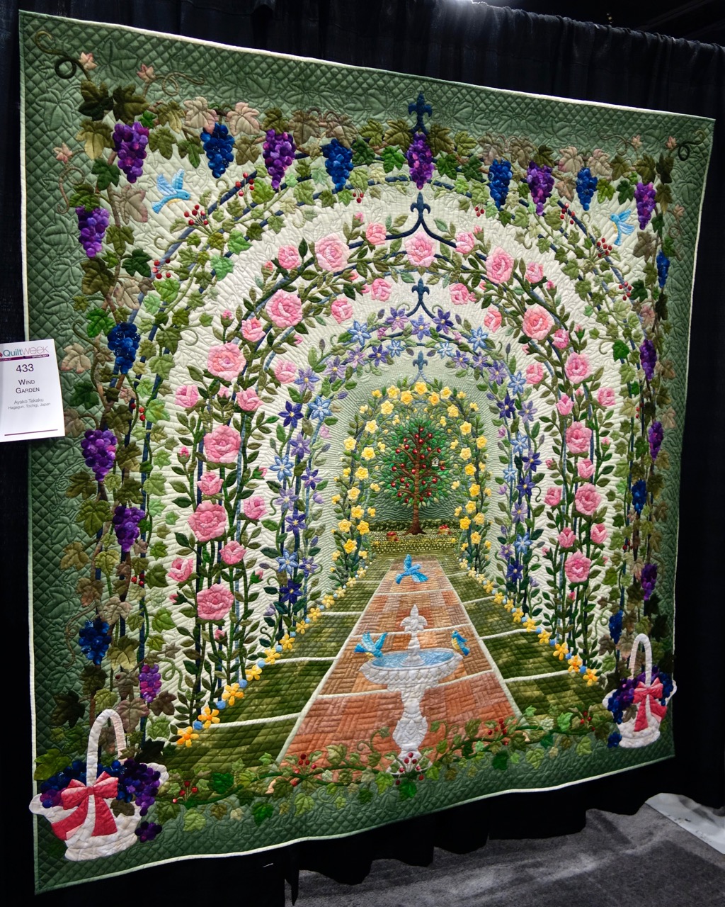This quilt by Ayako Takaku was a joy to stand in front of at AQS QuiltWeek Spring Paducah 2017. It is another quilt that would have won an award at any other gathering, but there were so many great quilts that it didn't win. Wind Garden is 78" x 78" and is Hand Quilted, Hand Emboidered, and Hand Appliquéd. The appliqué is fantastic and the quilting mixed with leaves and vines is beautiful. We loved the small bird at the bird house. See below.