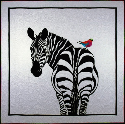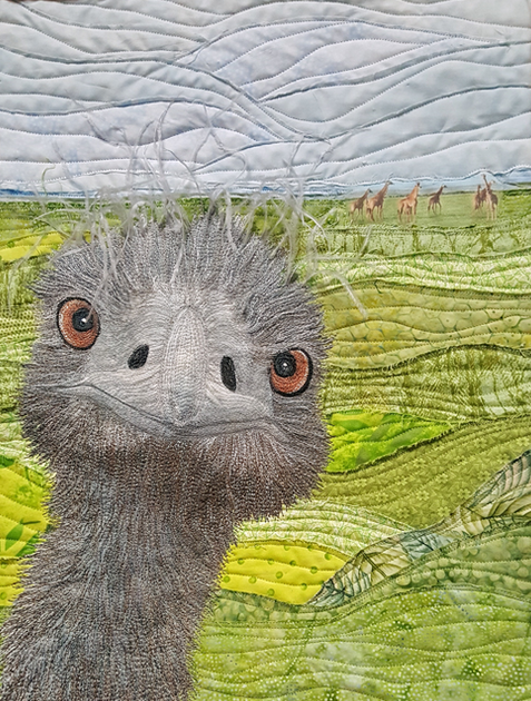 In the case of Photobomb by Sharon Baxter, what is the first thing you are immidiately drawn to when viewing the quilt? Is it the giraffes in the background or the undulating quilting of the landscape? Did you even notice that there are giraffe's in the quilt? NO, it is that adorable bird who seems to have purposefully stuck his head, front and center, into the scene.