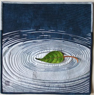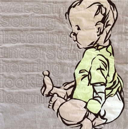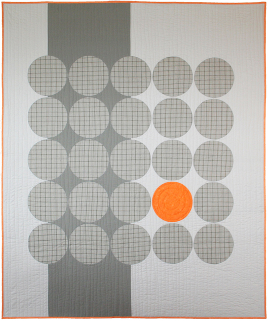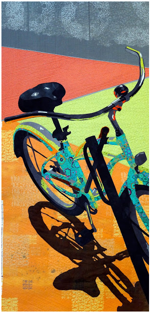 The title of the work, Photobomb, says it all. Wikipedia defines it as, "The act of accidentally or purposely putting oneself into the view of a photograph, often in order to play a practical joke on the photographer or the subjects." This is exatly what the bird is doing, and Sharon Baxter's brilliant use of emphasis, makes this quilt so absolutely hilarious and charming. She did her job; she got your attention.