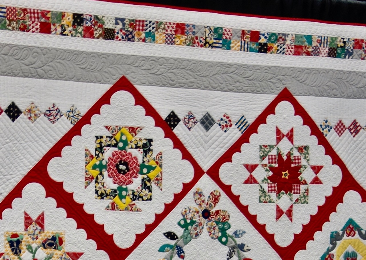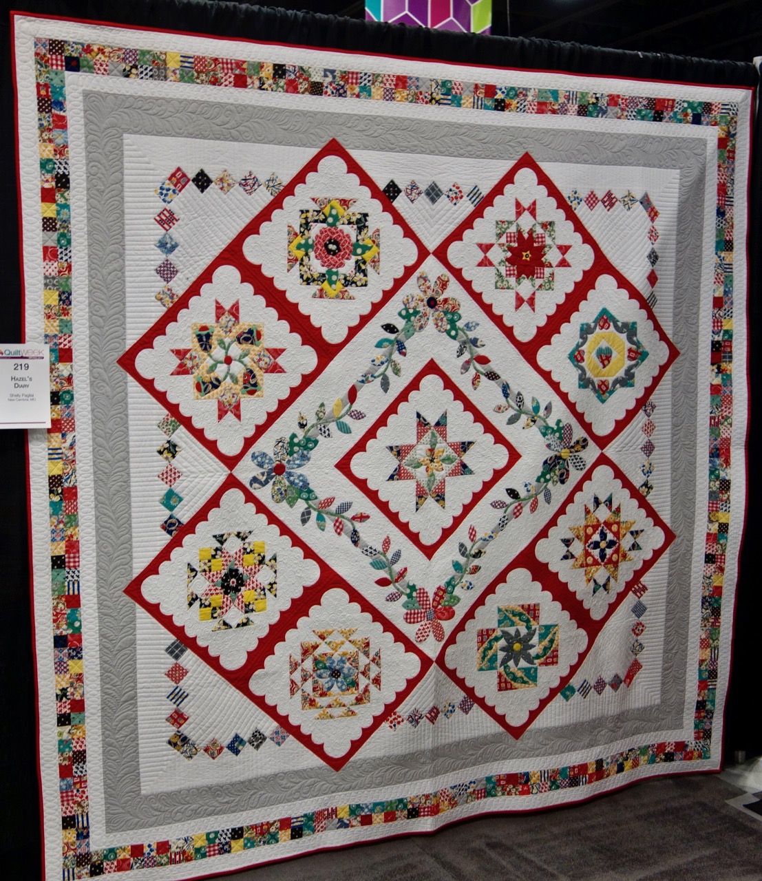 Shelly Pagliai ("Polly-eye") brings her country roots and wonderful creativity to reimagining her sampler quilt Hazel's Diary, 95" x 95". The on-point squares, the scrappy fabrics on the blocks, the scrappy fabrics in the border, and the wonderful quilting make this quilt a stand-out. We saw it in Spring Paducah 2017 and had to stop and smile.