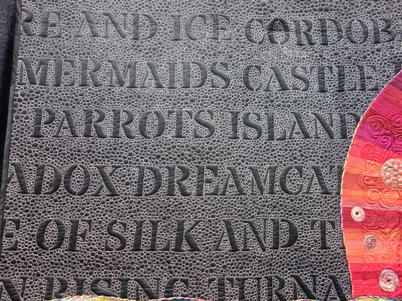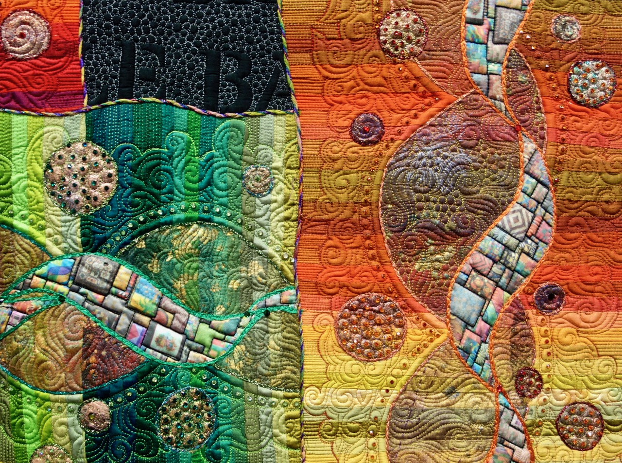 When we saw Claudia Pfeil's quilt Fractal in our Daily Blog, it reminded us that she had a quilt at AQS QuiltWeek Spring Paducah 2017 that we loved. Claudia seems to have mastered a number of quilting skills in her quilt, Woven Journey. It has Fused Appliqué, Couching, Crystals, Free-Motion Quilting, Photo Transfer, Improvisational Piecing, and Paper Piecing. The quilt was originally inspired by the PIQF 2016 theme, "Then and Now."