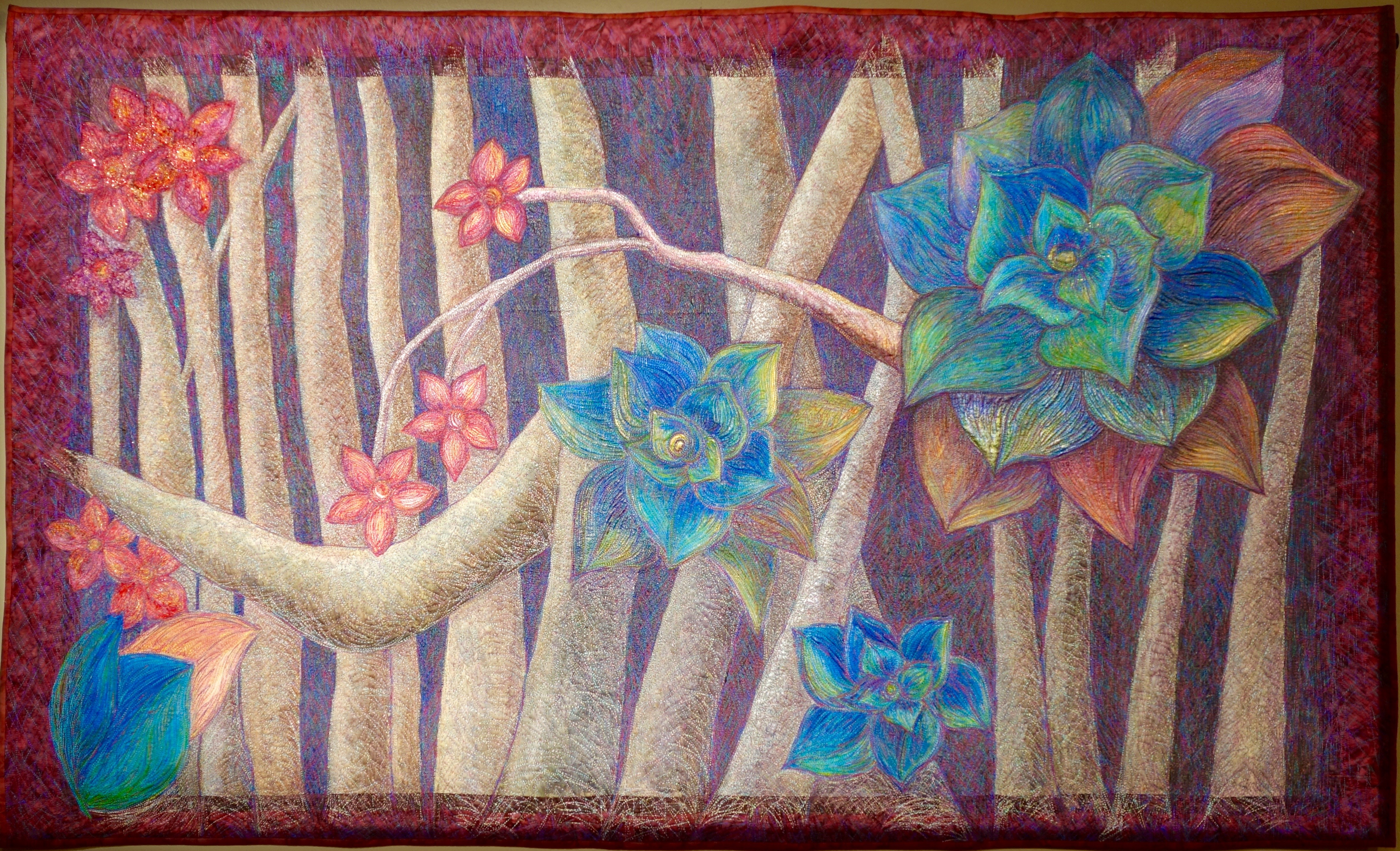 Forest Flowers is made almost entirely on canvas. Only the borders are fabric. Michele painted the entire piece and then "went to town" on her Innova adding the wonderful stitching.