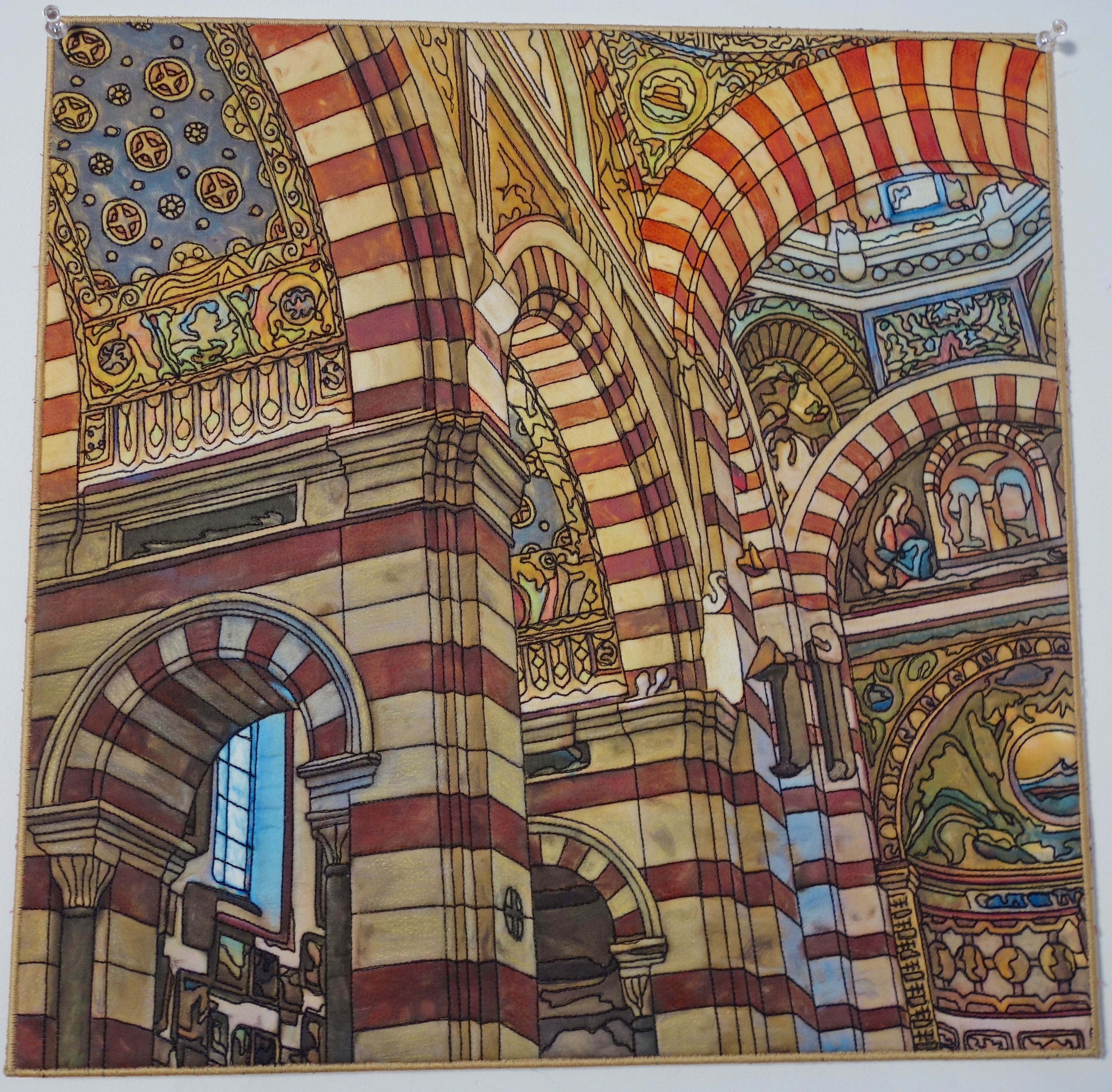 This piece is one in a series of quilts Judy created highlighting sites in the Mediterranean. This one features some spectacular architecture.