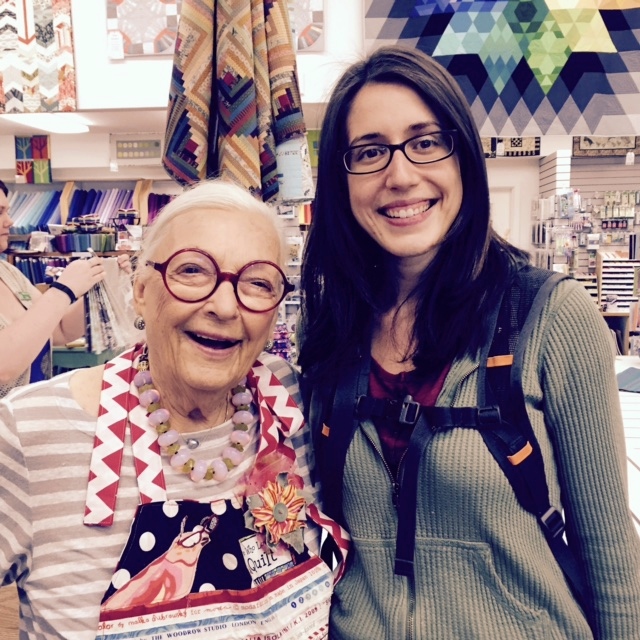 There are millions of quilters...there are thousands of quilt instructors...and, there are hundreds of quilt artists...but, there is only a handful of Quilting Royalty...and, that is where Freddy Moran lives her quilting life. She wasn't one of those people who had been quilting her entire life, but the artist within her must have been there all along because after the youngest of her five sons entered school, she signed up for her first quilting class. A trip to her first quilt shop provided the release that she needed. Freddy's color is Red...which she considers a neutral. You would think she would give her creativeness a rest...noooo...each year she continues to cause fireworks in the quilting world! About four years ago my DIL and I were shopping at The Stitchin' Post and found Freddy in her favorite isles of the shop, the brights! I took a photo of Em and Freddy explaining afterwards that Freddy was Quilting Royalty and her contribution to the quilting world.