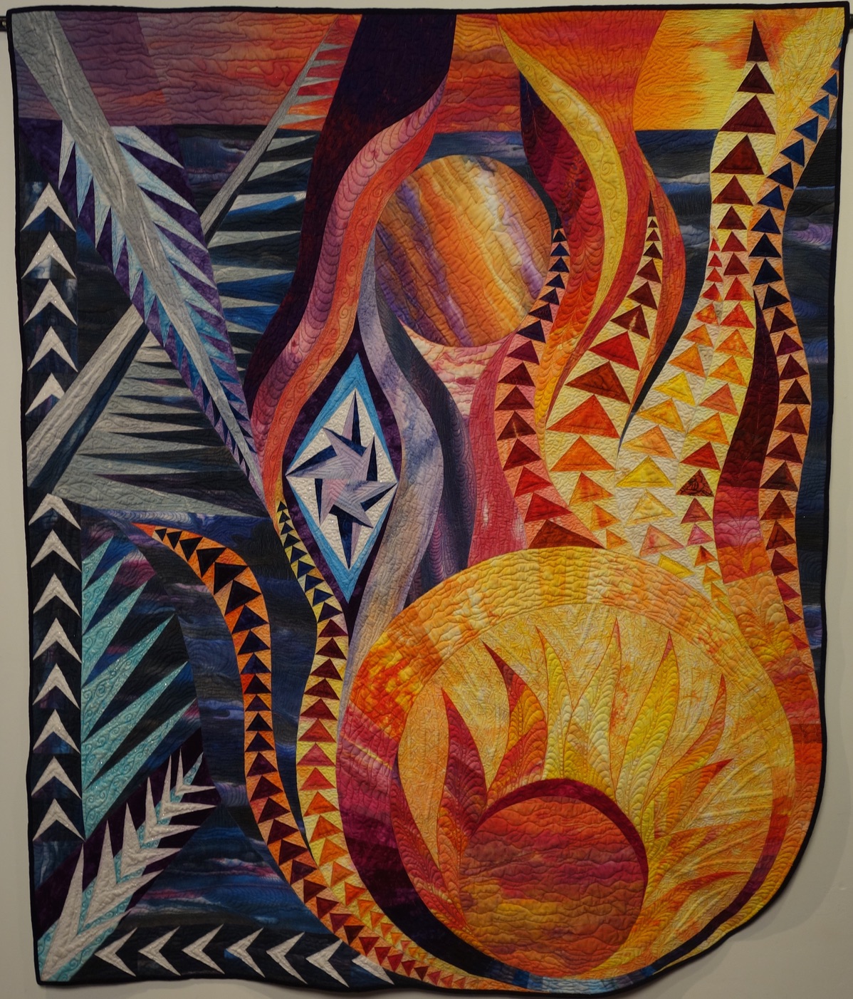 Gail writes about Climate Change, "A study in extremes: warm versus cool and gently curving versus jagged edginess. Climate change is neither gradual or calm, but can be quite violent as evidenced by the hurricanes and wildfires of 2017, four years following the completion of the quilt. Freezer paper foundation and curved seam piecing as well as hand embroidery. Longarm machine quilting by Kris Vierra."