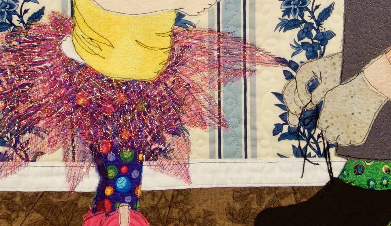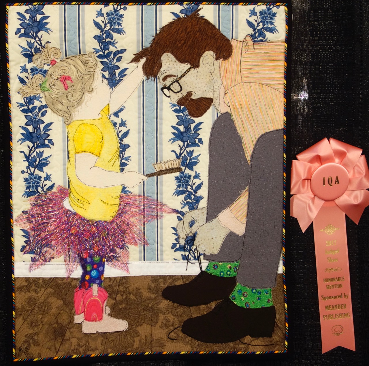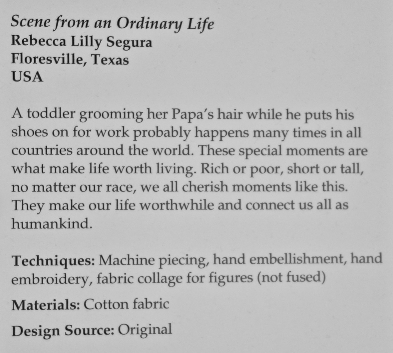 I'm a grandparent, so sue me if I like cute kid things. Rebecca Lilly Segura won an Honorable Mention for her quilt "Scene from an Ordinary Life" in the Art-Miniature category at Houston 2017. BUT don't miss the techniques used in this adorable quilt. See the sign at the bottom.