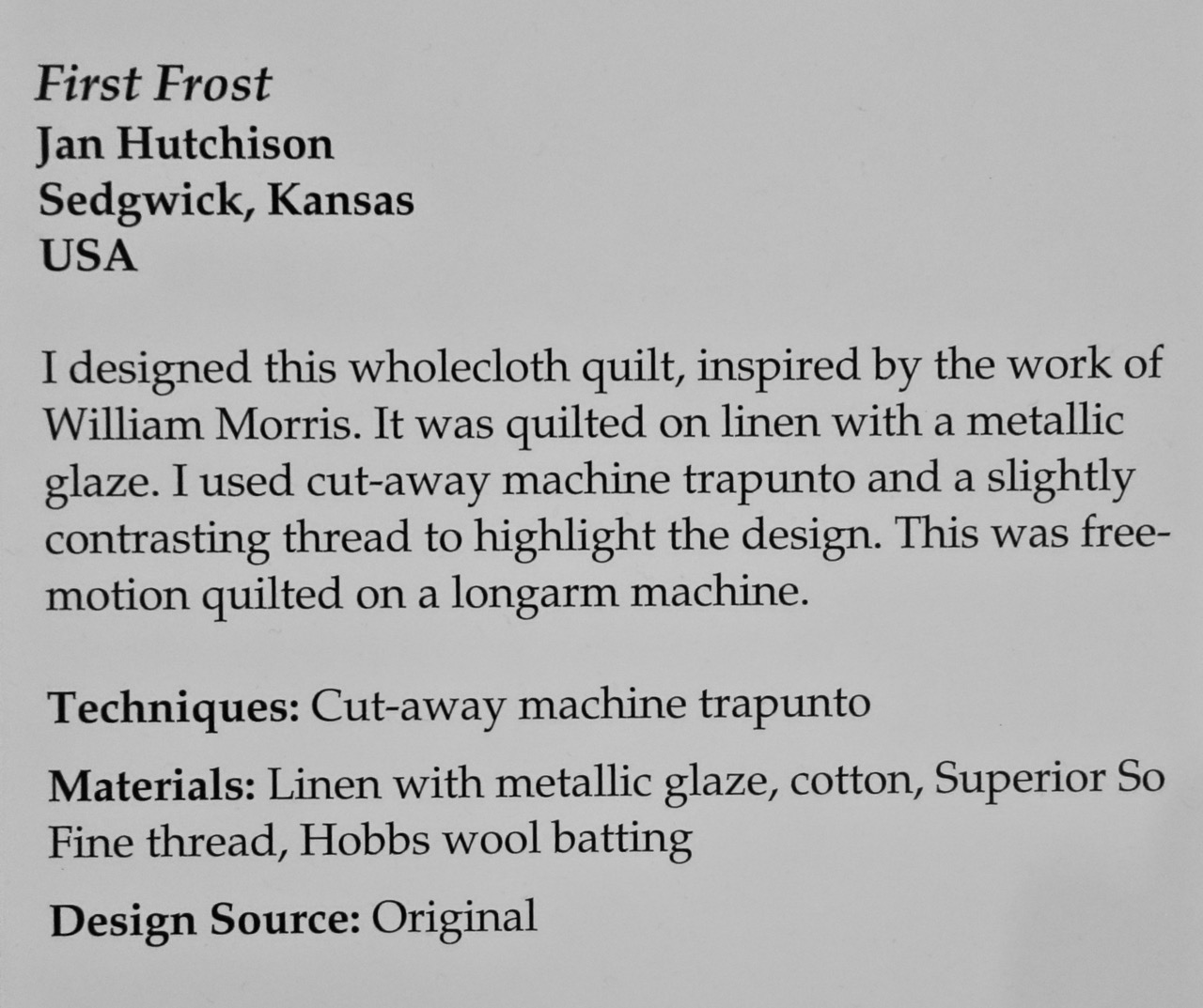 Whether she is working on award-winning quilts with Gail Stepanek or working alone, Jan Hutchison creates amazing quilts. "First Frost" won 2nd Place in the Merit Quilting Category. It is based on designs by William Morris, so I guess she IS working with another award-winner.