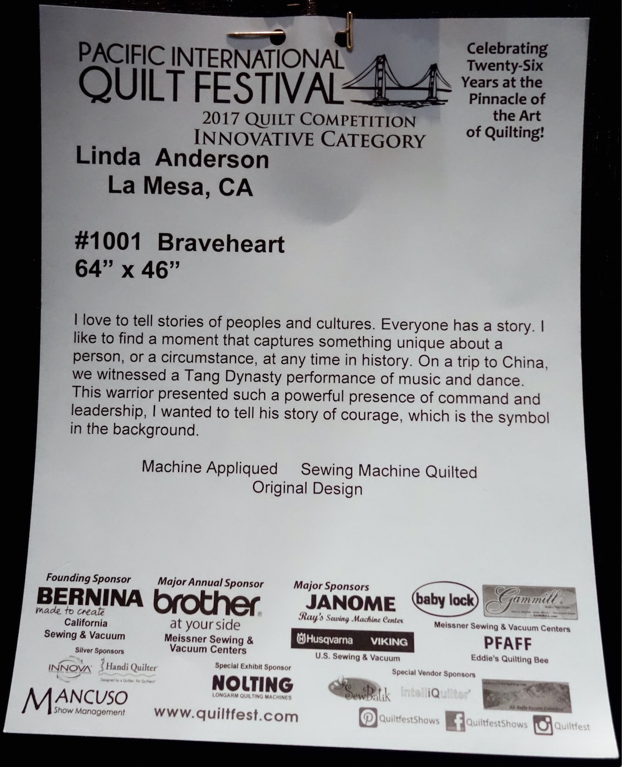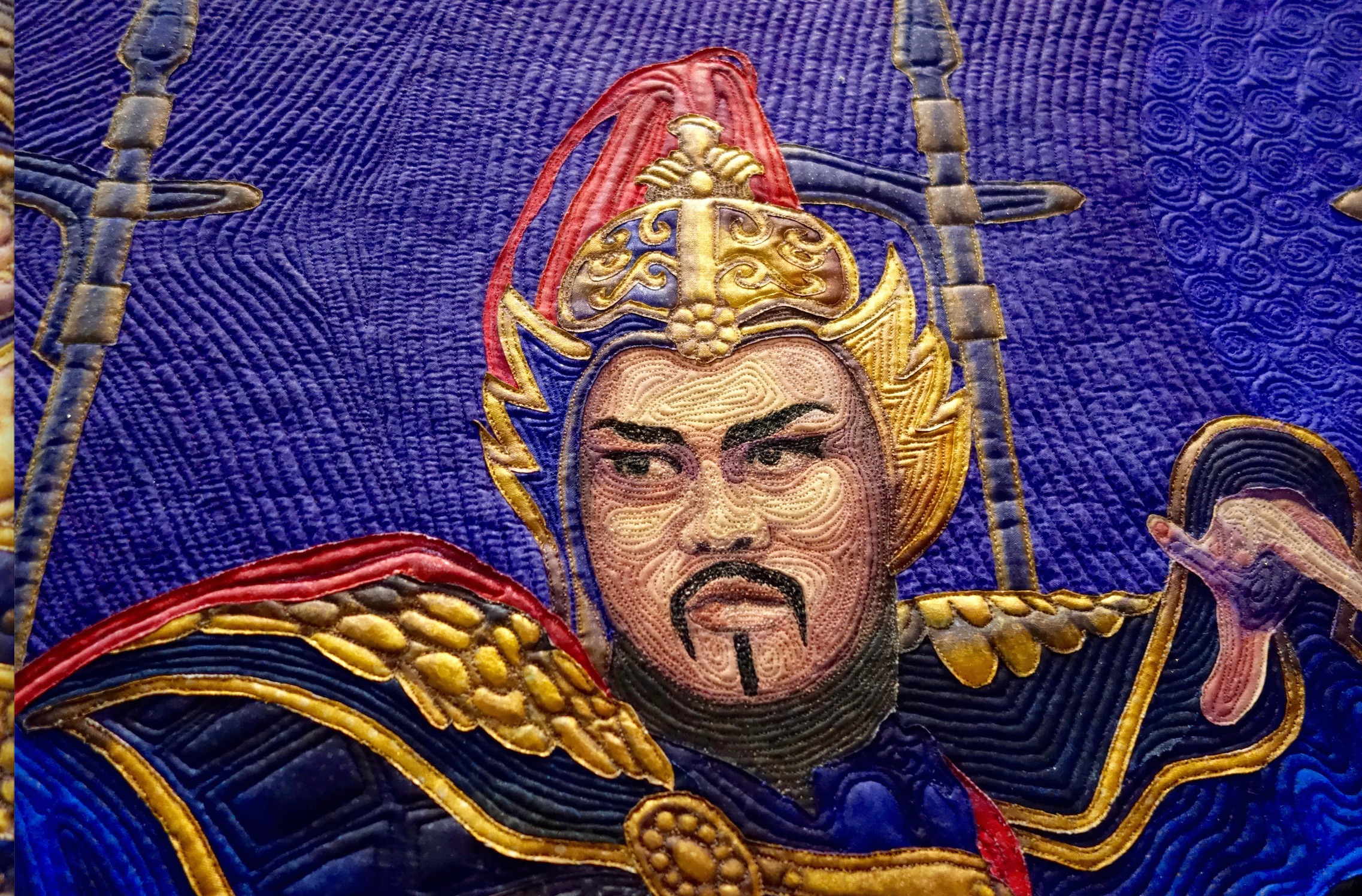 Linda Anderson took a trip to China and was captivated by a Tang Dynasty performance of music and dance. The warrior in the performance had such a powerful presence of command and leadership she wanted to tell his story in her quilt, Braveheart.