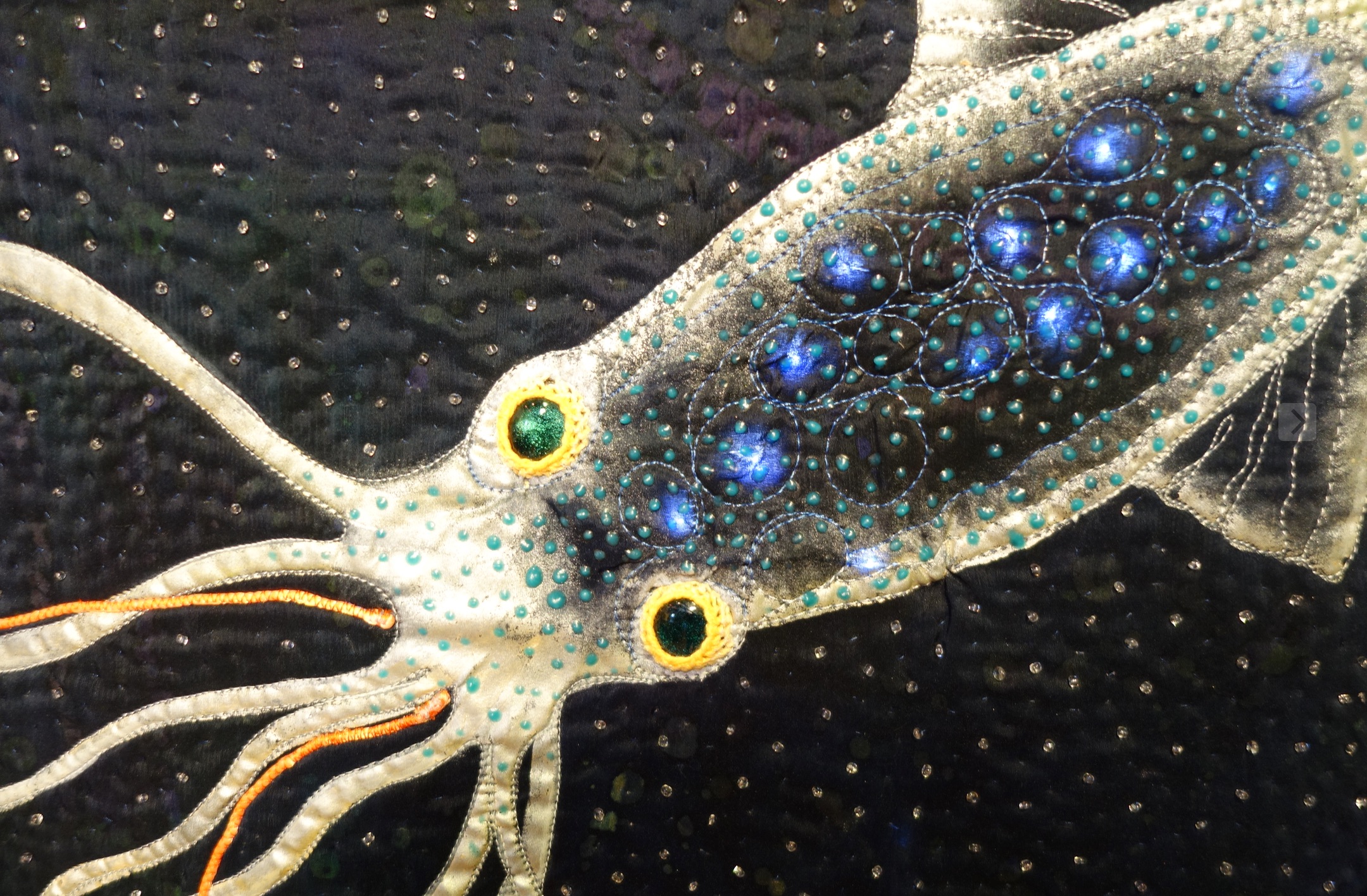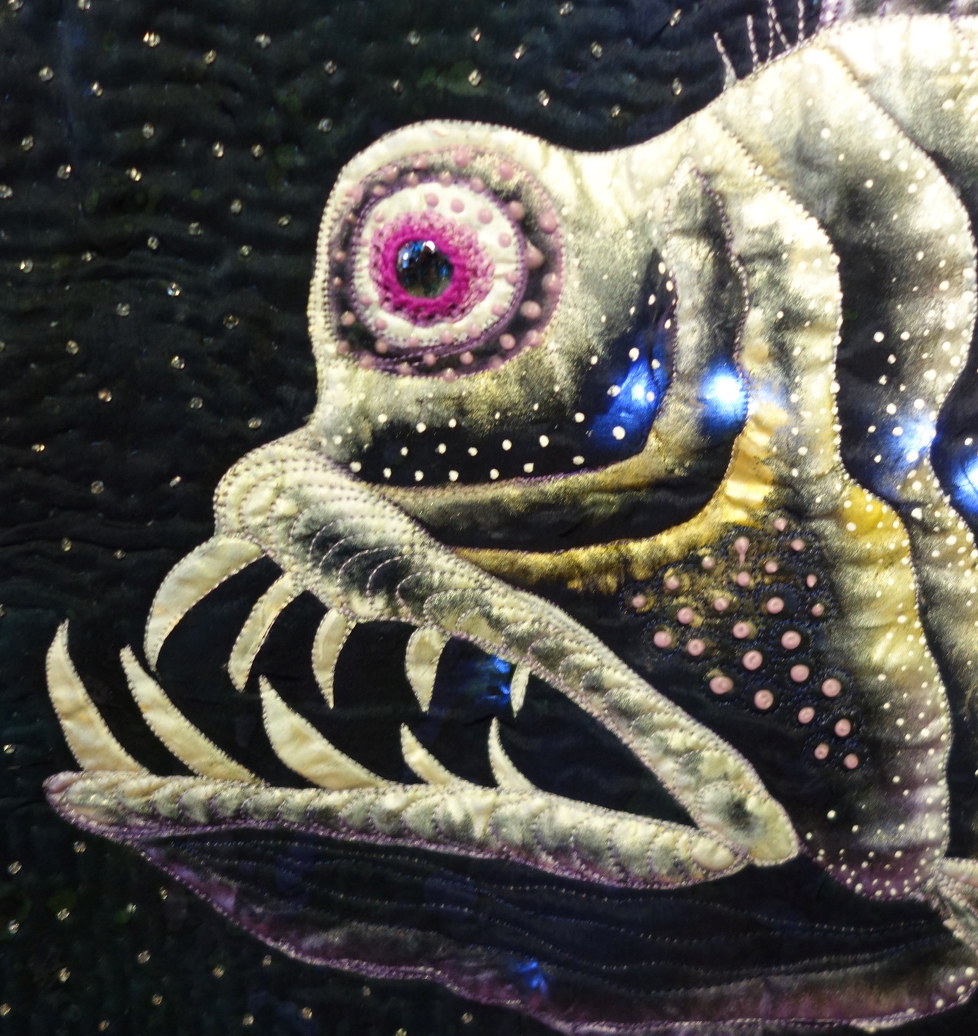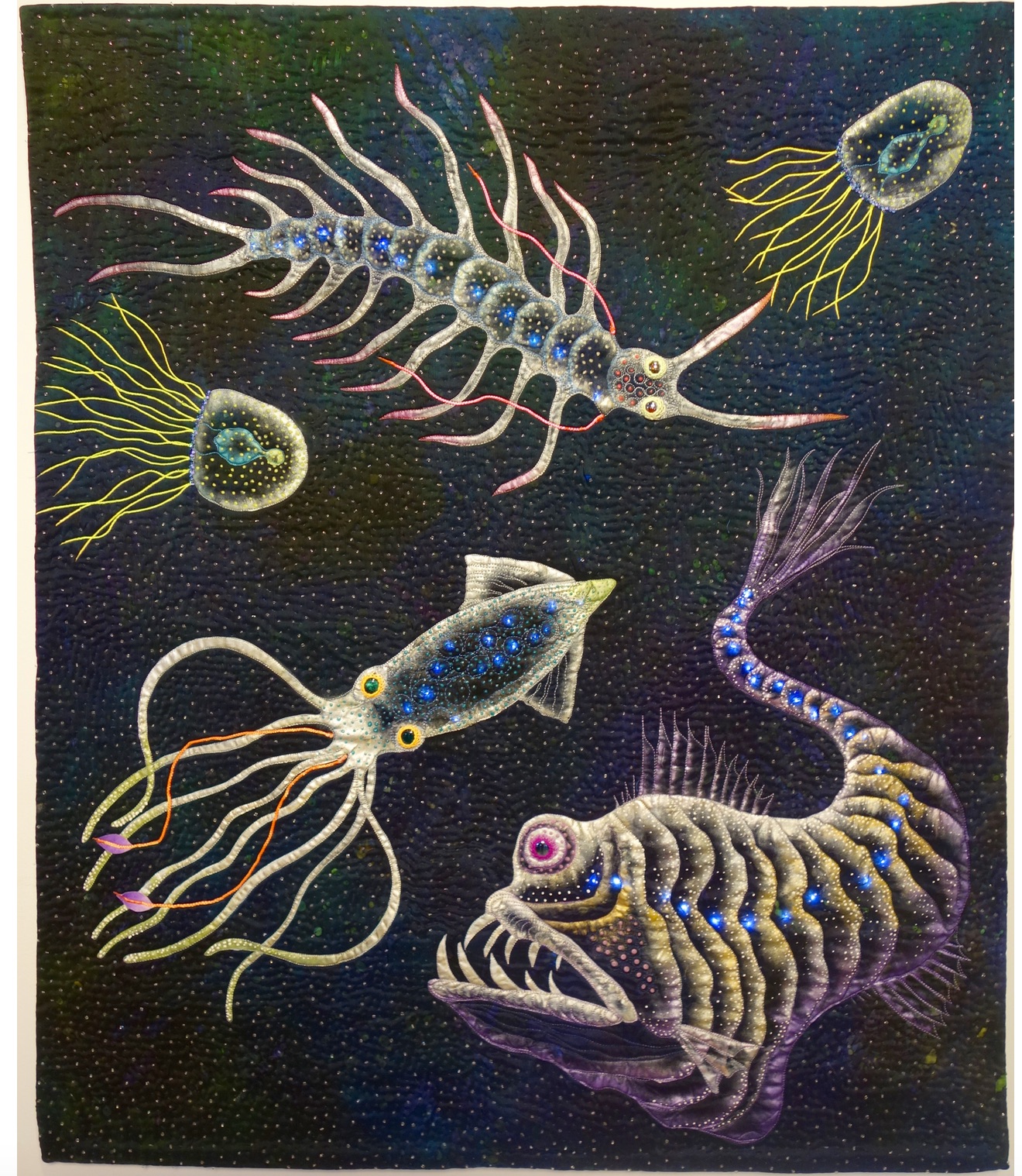Travel to the bottom of the ocean with Betty Busby in her quilt, The Abyss. Mythical looking creatures light up, literally, in this eerie and enchanting quilt.