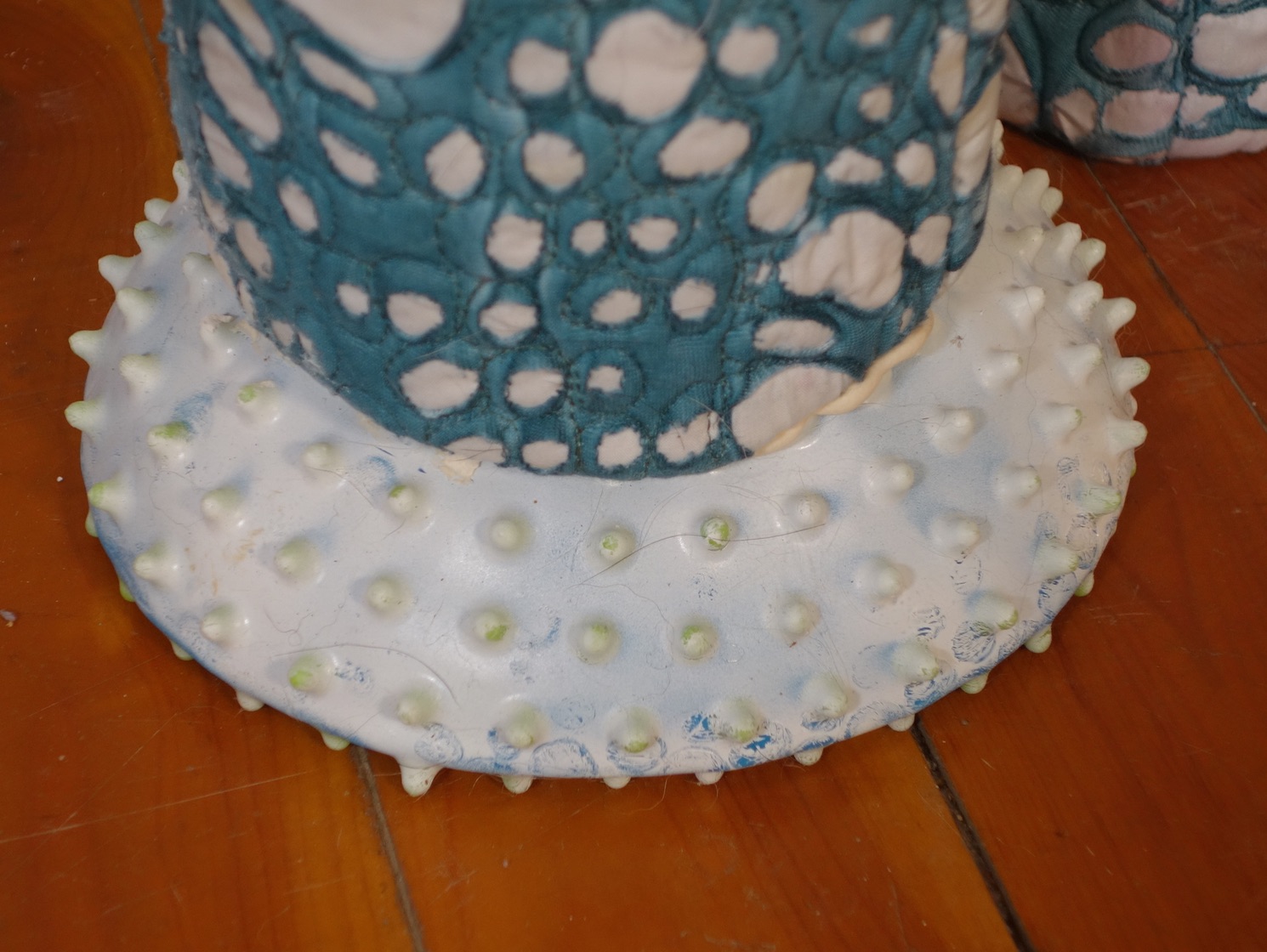 Betty Busby played at "Arts and Crabs" with her two little sisters as a small child, and continued her obsession through graduation from the Rhode Island School of Design, with a ceramics major. With this work of textile art, she combined the love for her sisters, quilting, and ceramics.