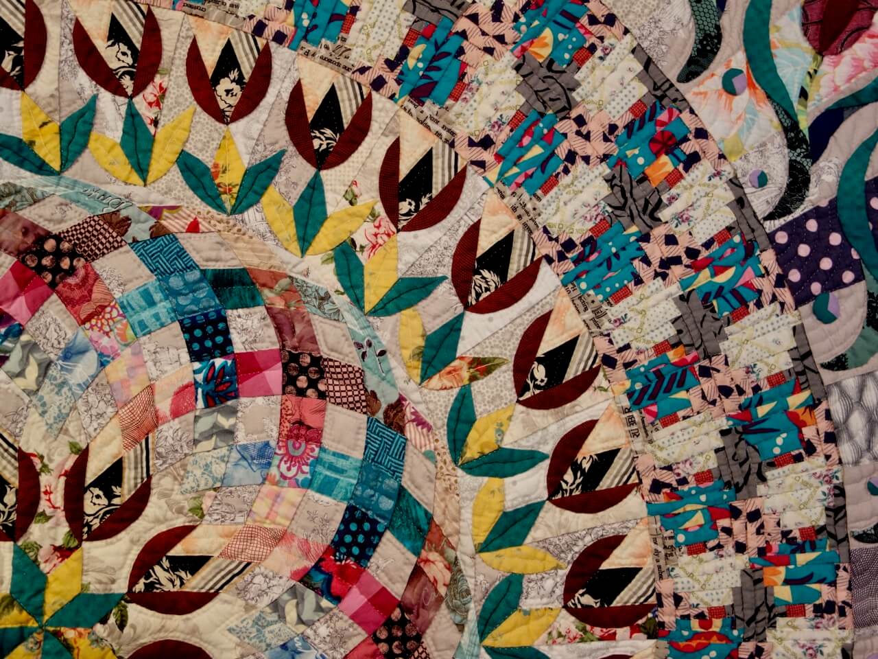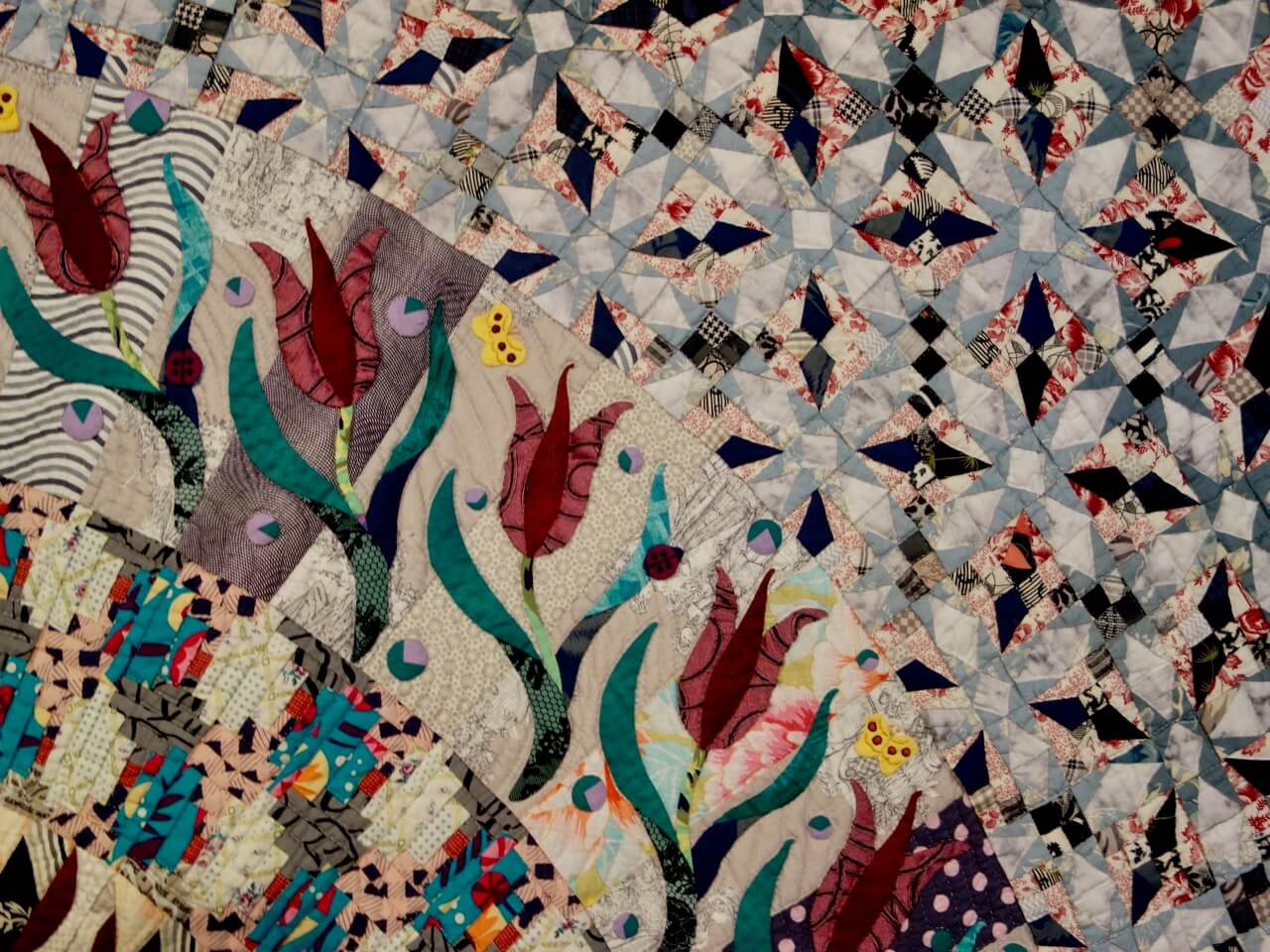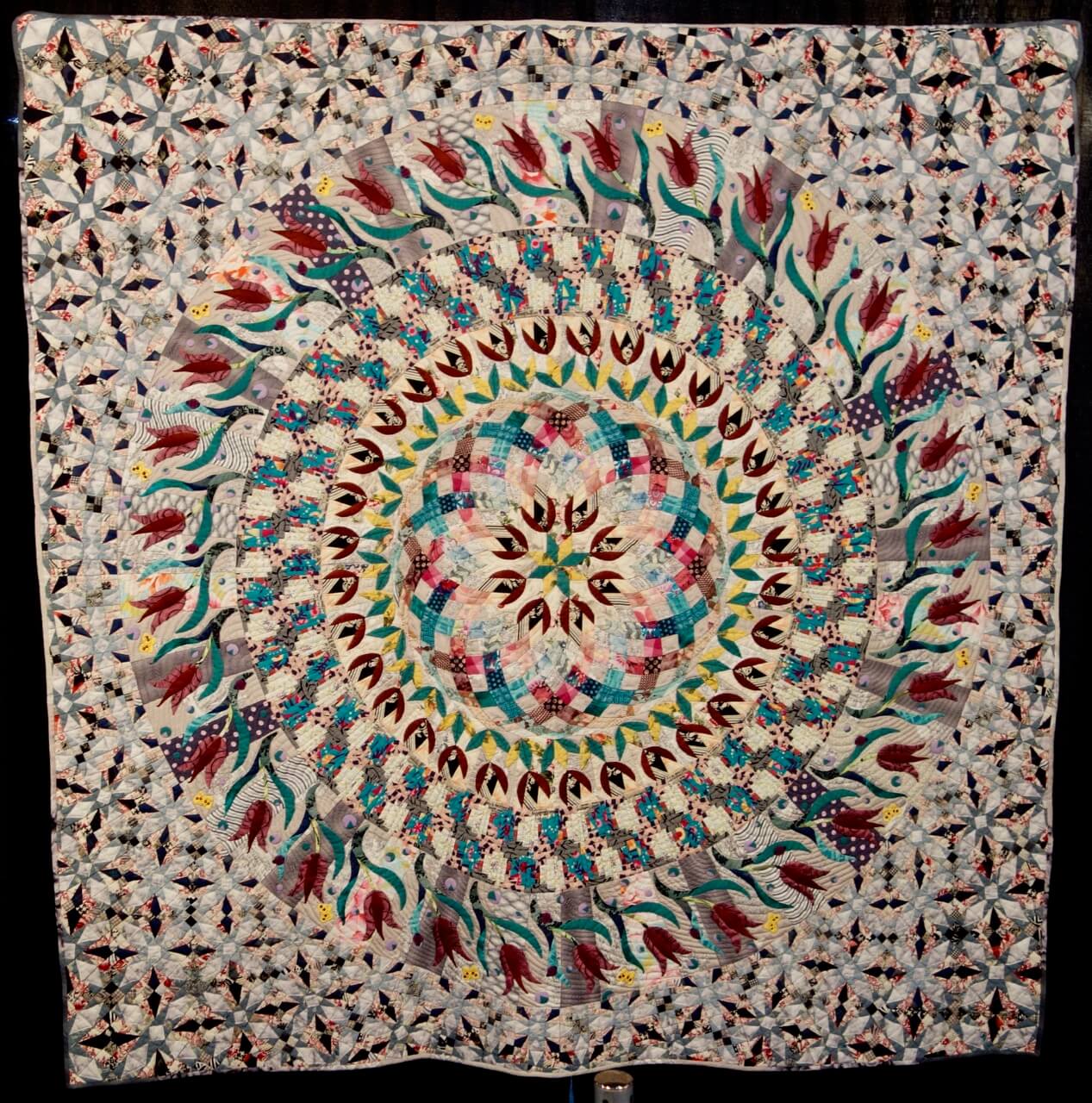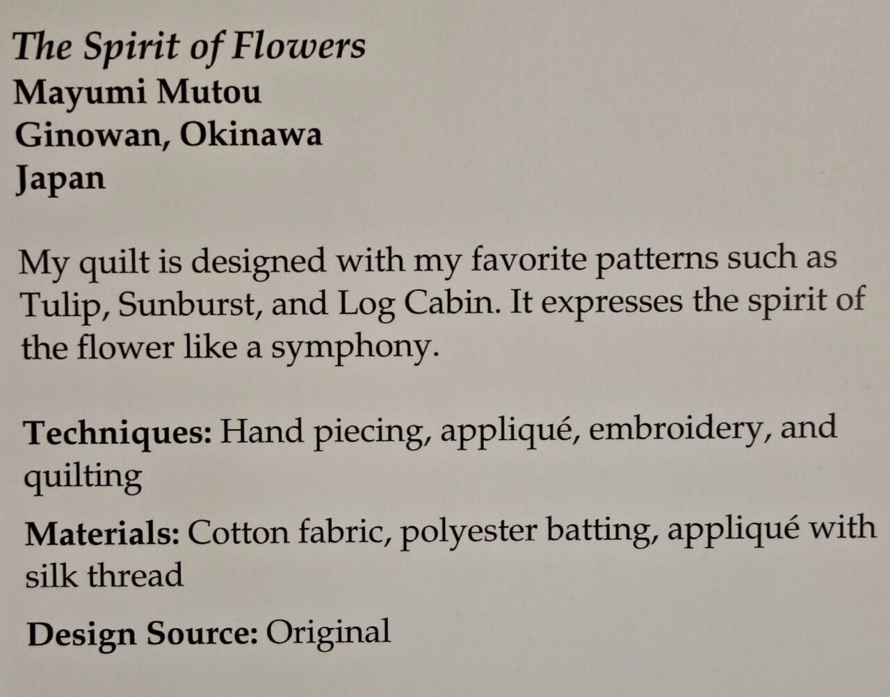There is a lot going on in this wonderful quilt we saw at Houston 2017 by Mayumi Mutou. The Spirit of Flowers uses her favorite blocks and creates curves and circles throughout the quilt. Take a look at the fabrics too. Stand back for just a bit and let your eyes wander around the quilt. Whew! I'm tired just looking.