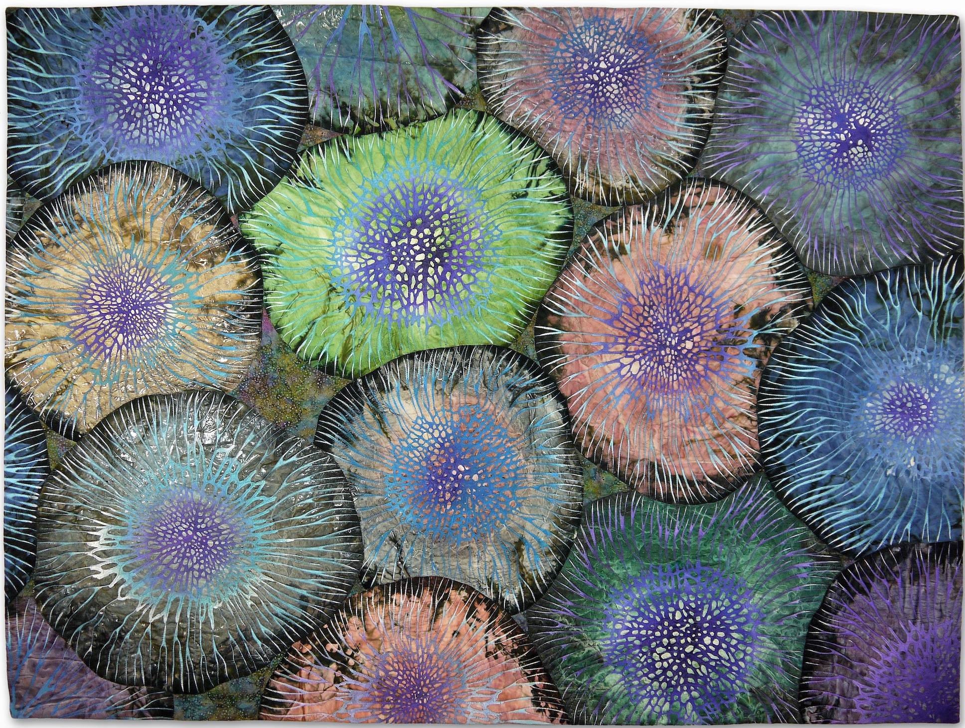 Betty Busby's quilt, Dark Lichen, is inspired by macro-scale images of lichen which can grow on even bare rocks in the desert. She created this quilt using machine appliqué, fusing, and painting.