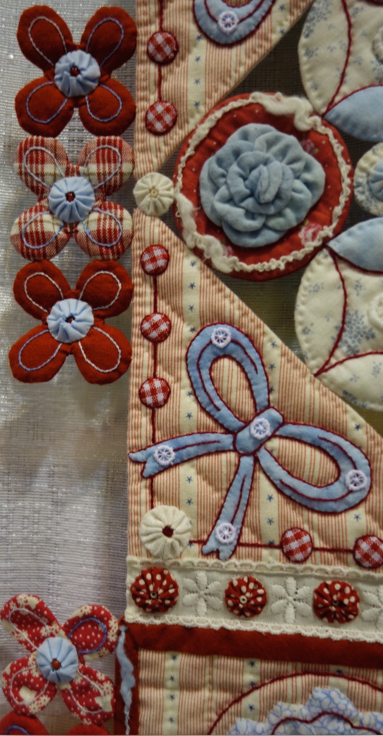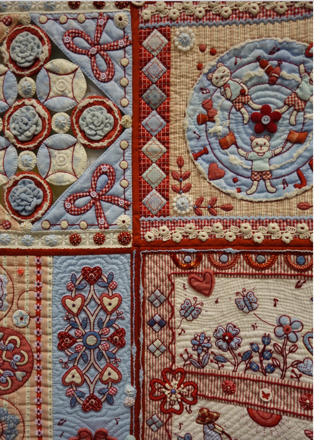 Aki Sakai is no stranger to teeny tiny details as you can see in her quilts, Merry Christmas and Happy Halloween 2. In Joyful Heart she uses the quilt as an "album" to share her memories.