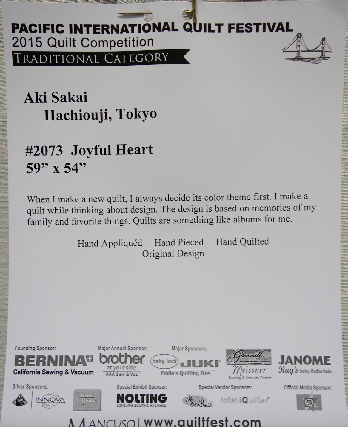 Aki's quilt won Best Hand Workmanship at AQS Lancaster 2014 and Best Use of Embellishment at PIQF 2015.