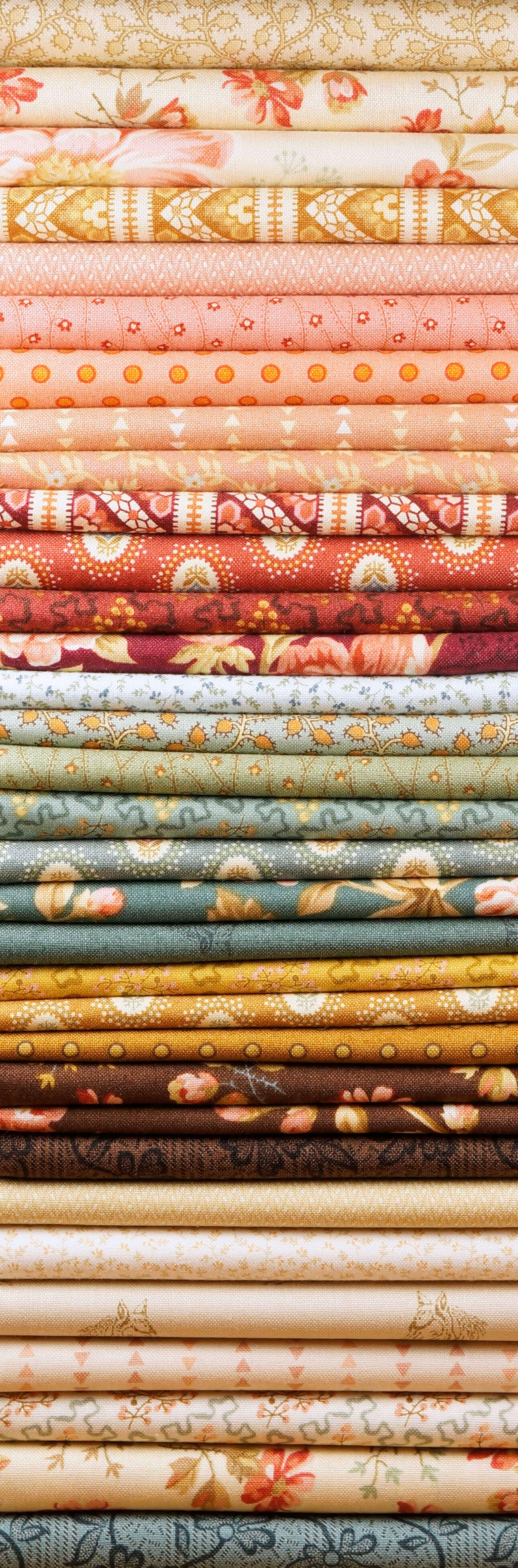 We are cutting fabric like crazy as the Crystal Farms bolts arrived late last week. We liked this colorway for The Patchwork Barn Quilt, but now we really love it. The fabrics came in with richer colors than we expected. The glowing salmons and rich chocolate colors are not well represented in the overall picture we have. You are going to be thrilled. We have to warn you that we only have 100 of these kits unsold. Please don't delay. It took a long time to get these fabrics and we probably can't get a full set again.