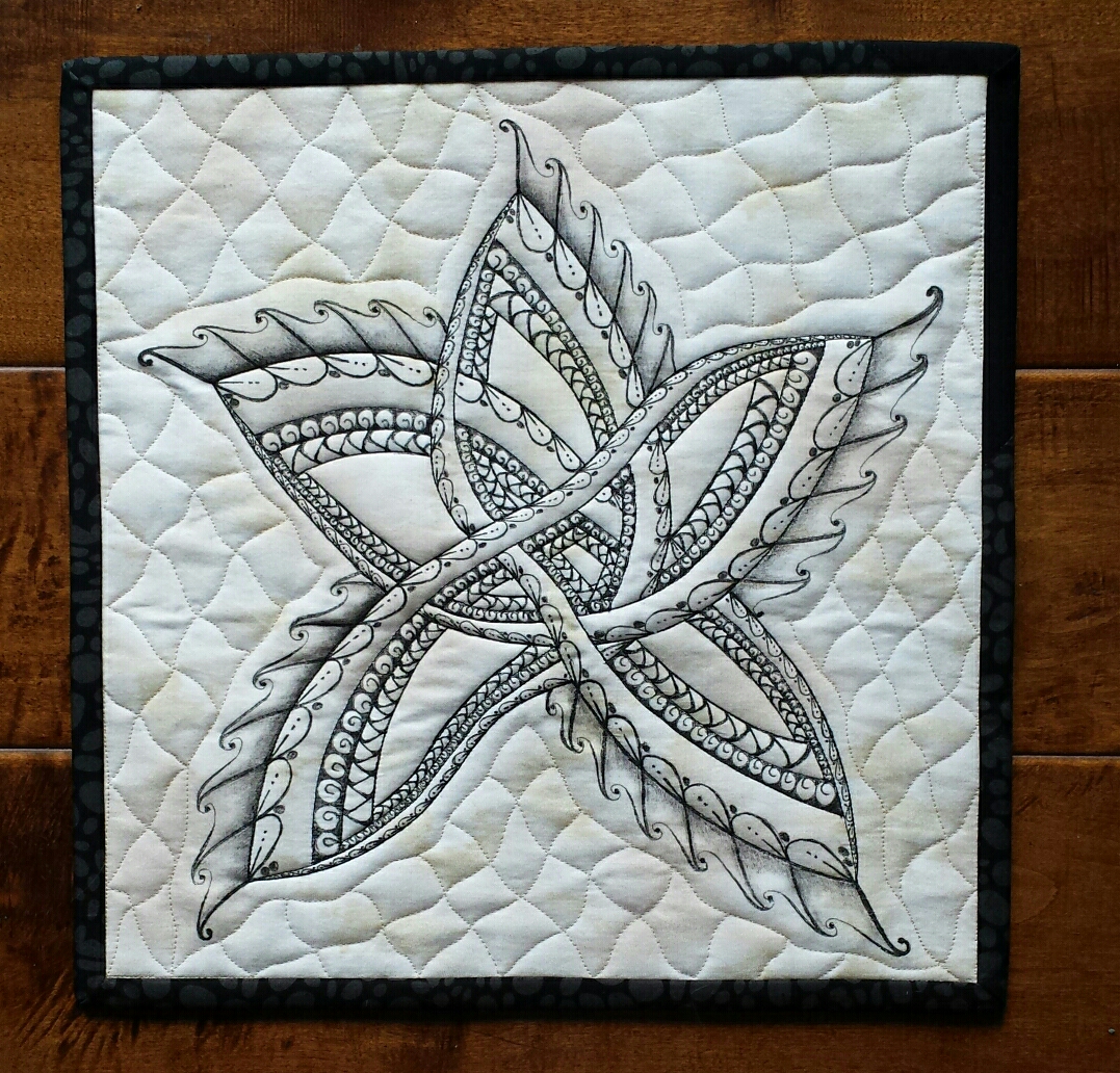 The quilting accentuates the star caught in a net. The Zentangle Star was made with quilted "ribbons" embellished with Pigma Pens to create the designs.