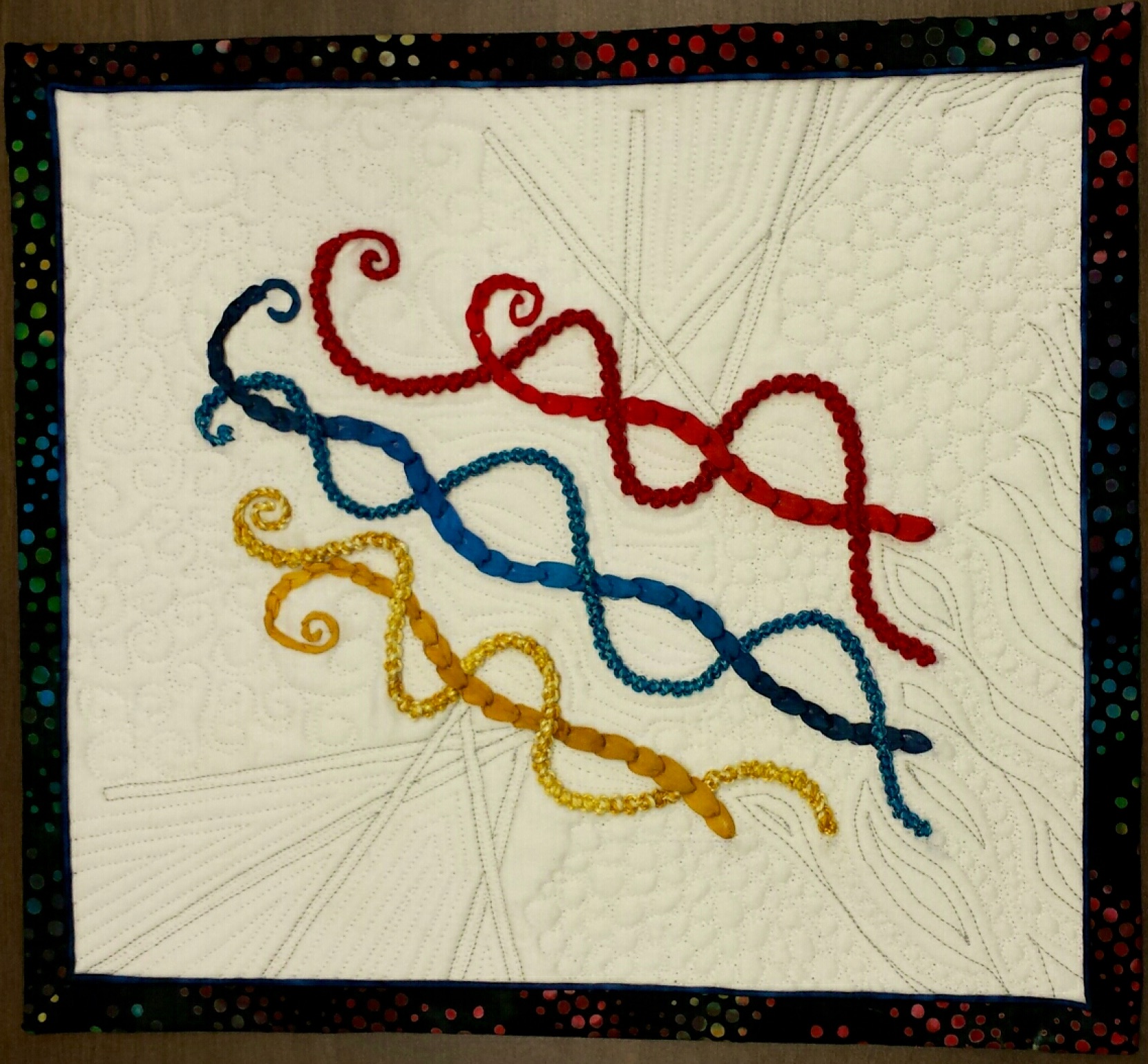 Wendy writes, "This design is ribbon appliqué in a split stitch intertwined with a string of candlewicking knots in heavy thread. I love the shades of the primary colors and how the shapes dance with each other. I tested my free motion quilting with straight stitches and realized they needed to show a bit more. So I used the grey thread in a few places and continued to use different free motion quilting techniques. - straight lines, pebbles, flames and curls."