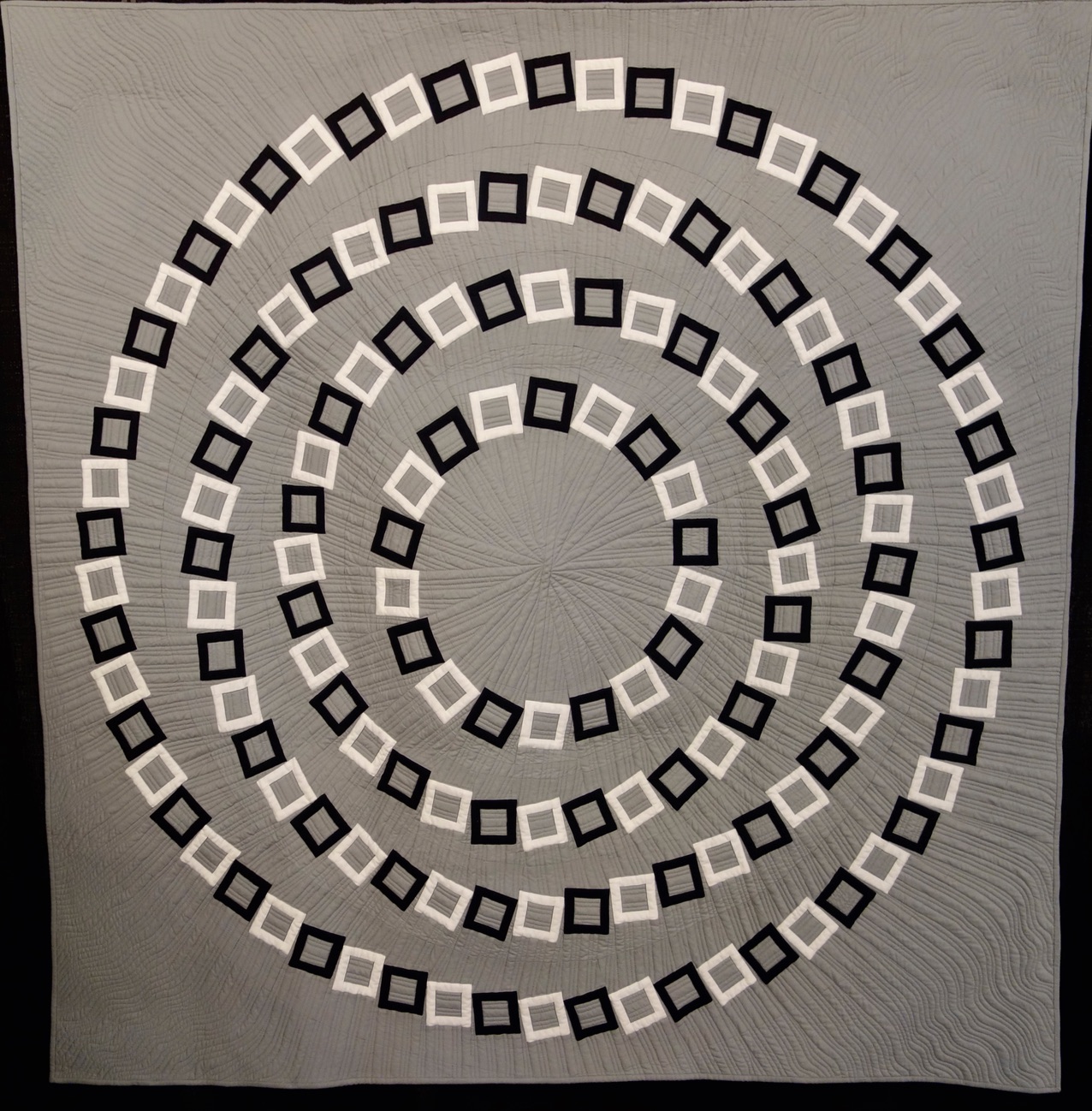 "Dared by a friend, I reconstructed the 2002 Pinna illusion and made a quilt of it. Foundation paper pieced, hand-appliqued, and free-motion quilted. Permission to show the quilt graciously granted by Biangio Pinna, the original designer of the illusion."