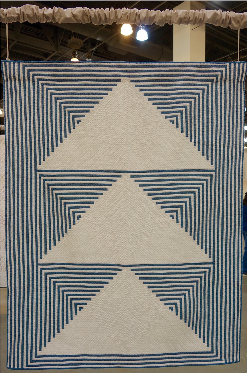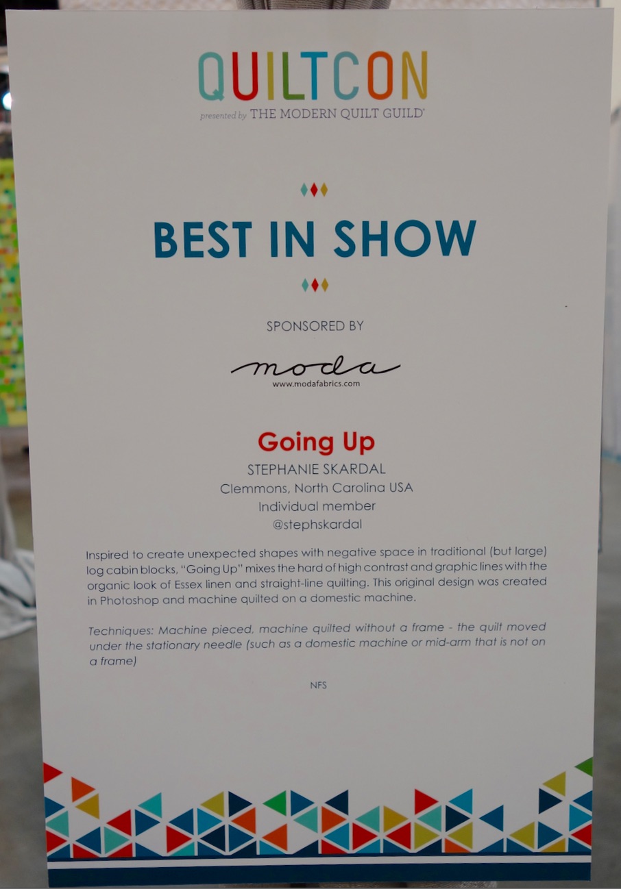 Going Up, pieced and quilted by Stephanie Skardal, was awarded Best of Show at QuiltCon 2018. Stephanie writes, "Inspired to create unexpected shapes with negative space in traditional (but large) log cabin blocks, Going Up mixes the hard of high contrast and graphic lines with the organic look of Essex linen and straight-line quilting. This original design was created in Photoshop and machine quilted on a domestic machine."