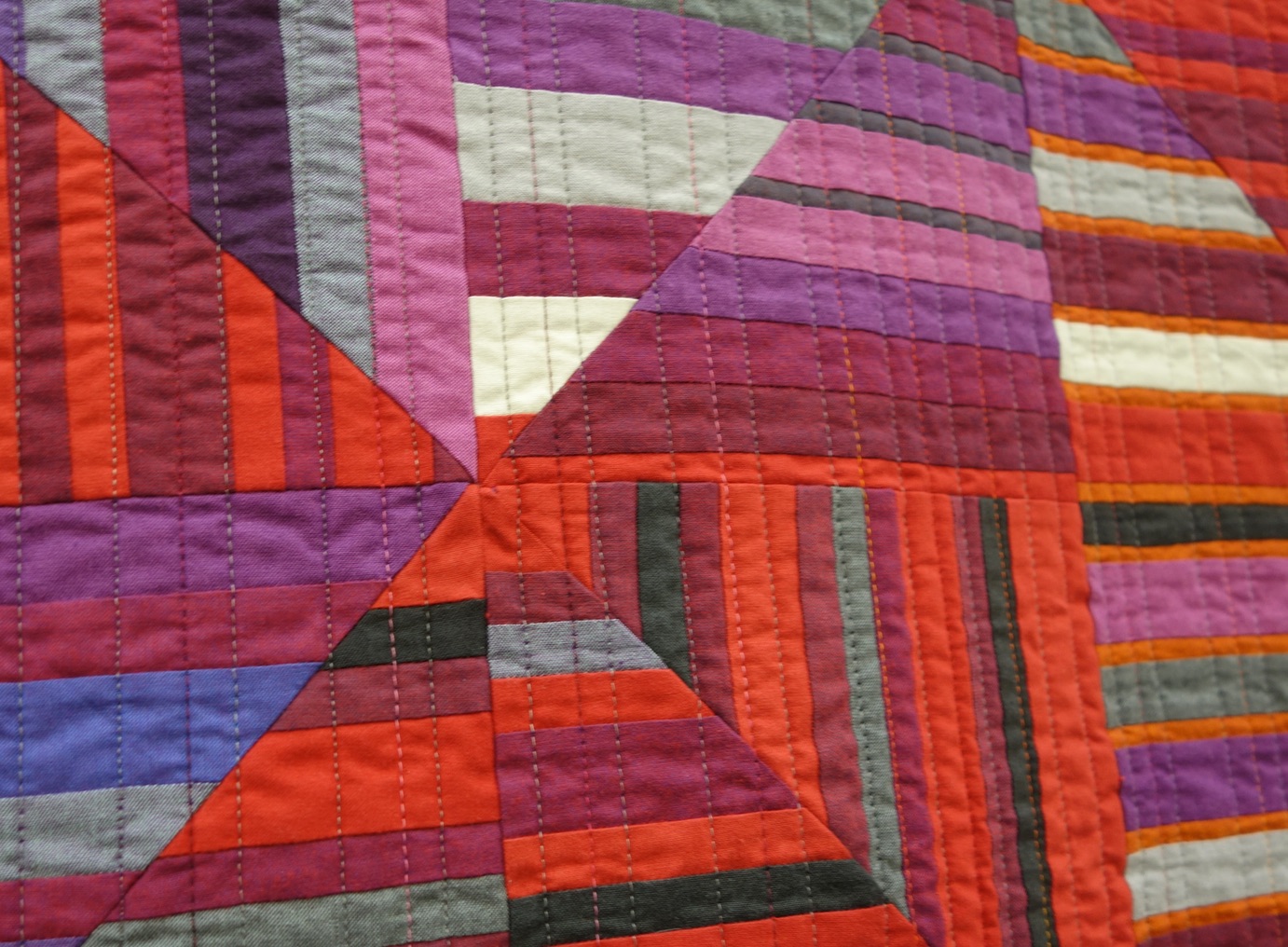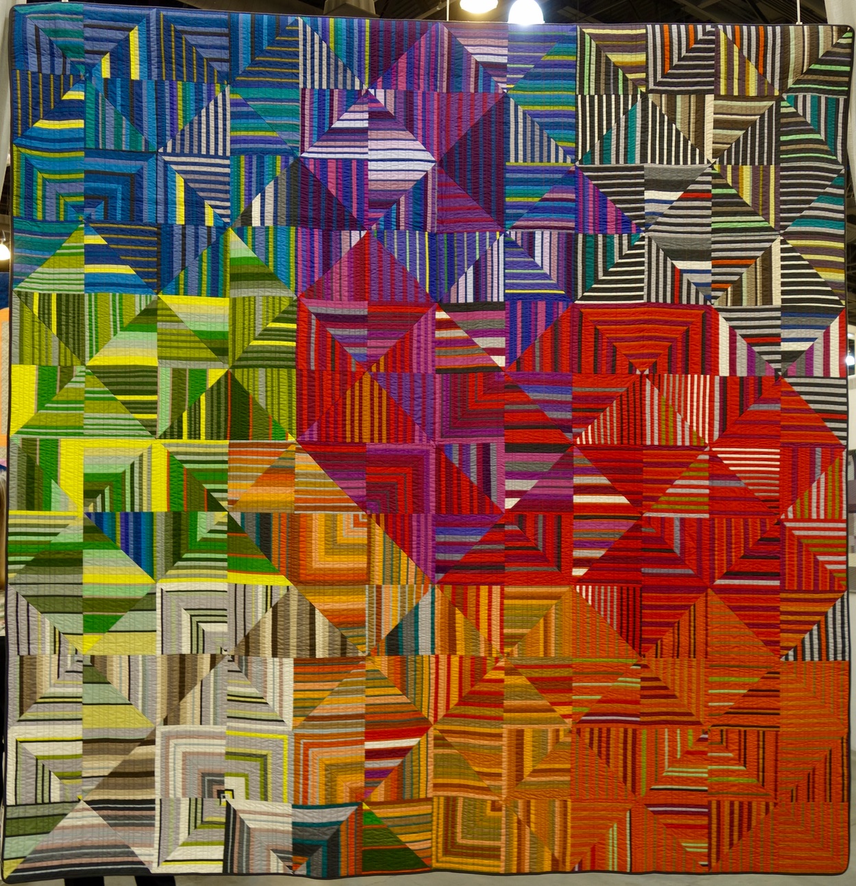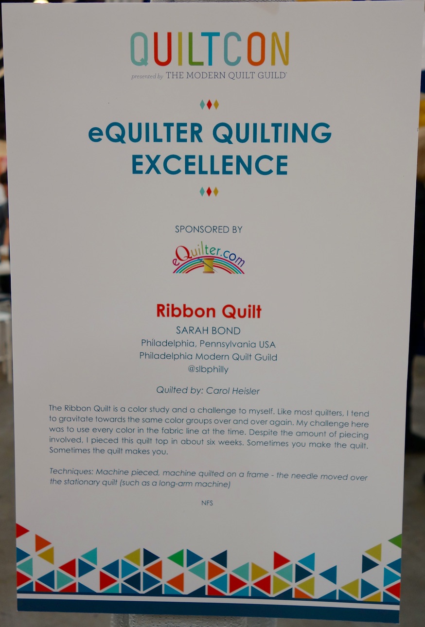 Sarah Bond's Ribbon Quilt, quilted by Carol Heisler, won the eQuilter Quilting Excellence Award at QuiltCon 2018. Sarah challenged herself to use every color in the fabric line at the same time. She writes, "Sometimes you make the quilt. Sometimes the quilt makes you."