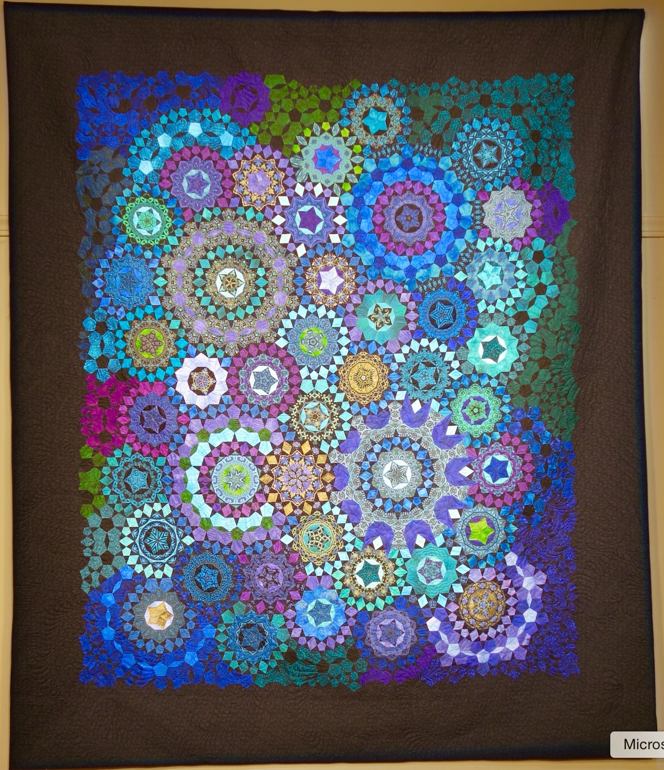 Diane's luminous quilt, "Celestial," is from "Millefiori Quilts" by Willyne Hammerstein. It is the same pattern as the cover quilt of the book.
