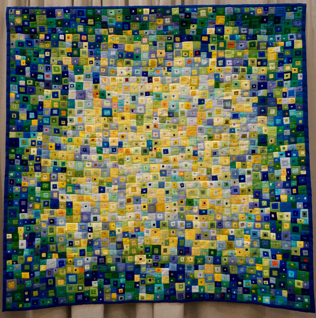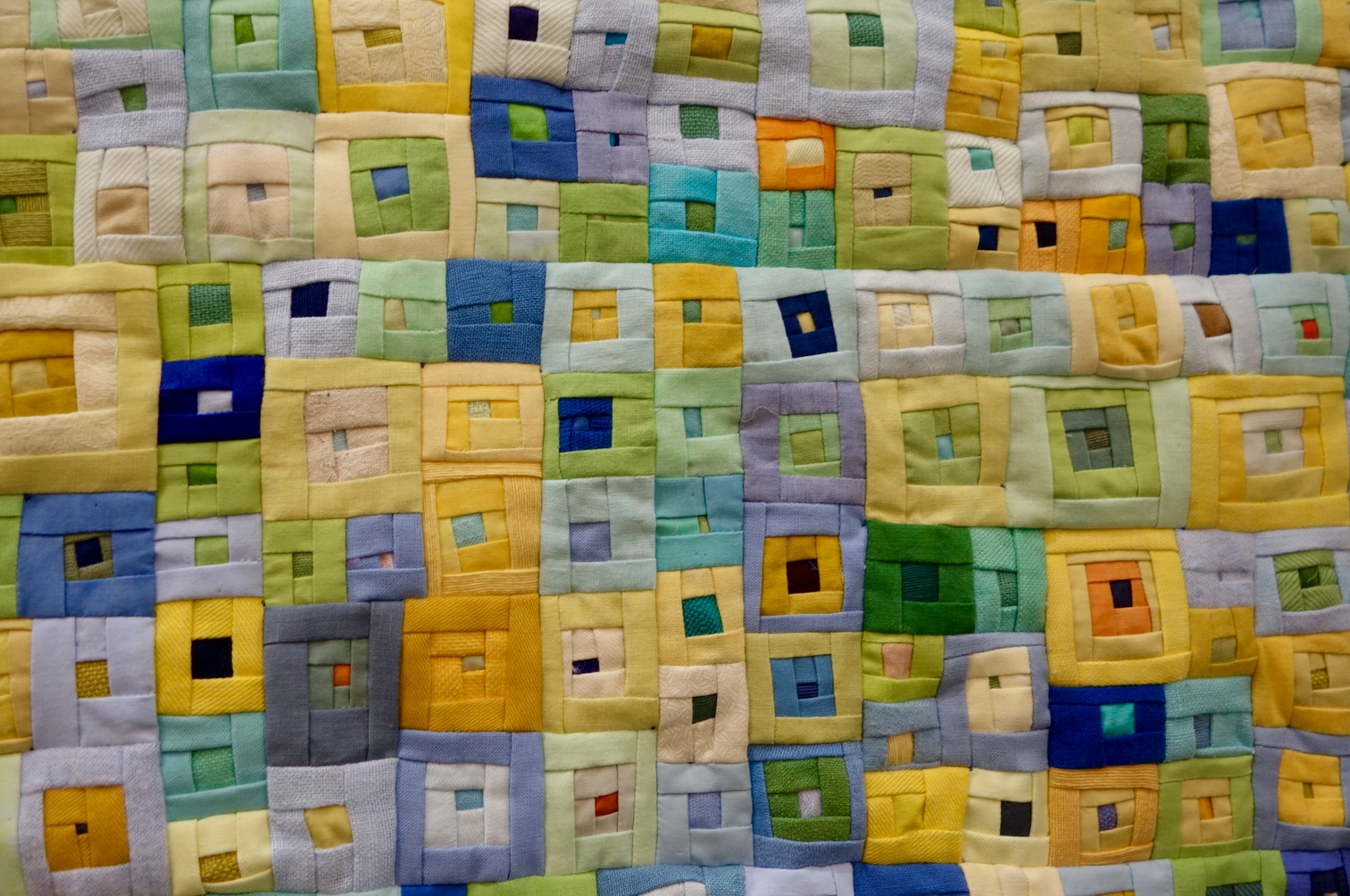 While this quilt seems to shimmer and glow, we were struck by the size of the log cabin blocks used to create the illusion. They were some of the smallest blocks we've ever seen and this was NOT a miniature quilt. Each block is about the size of a quarter.