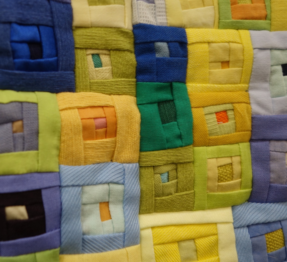Beatrice writes, "Colors and structures are important to me. I like "painting" with small pieces of fabric--simple forms like squares, stripes, or log cabin blocks. There are always pieces left over which inspire me to start new creations, so there is no end! The parts don't have to match exactly, but somehow they grow together, the whole remaining a playful game."