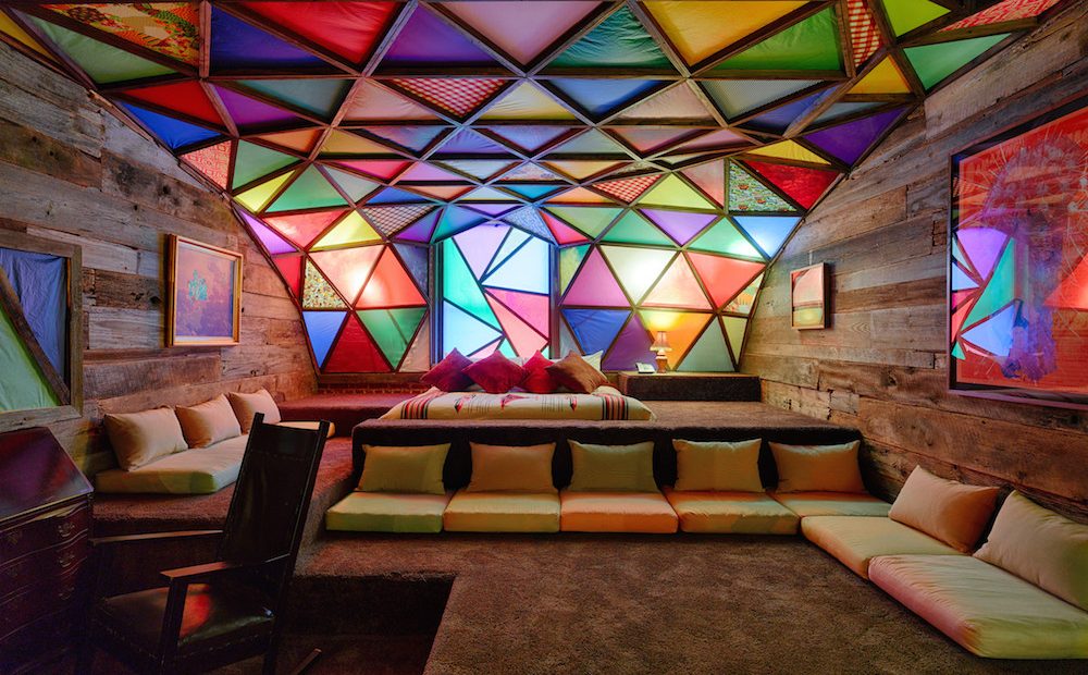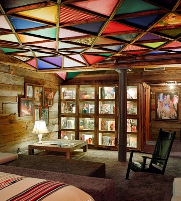 "Asleep in the Cyclone" is an art installation in a hotel room. The hotel is the 21c Museum hotel in Louisville, Kentucky. We were caught by the use of triangles but were worried that quilters would lose sleep wondering if the ceiling was a design wall and whether they could change the colors and placement. Here are a few pictures. Click on LEARN MORE to get more information about the artists including a 2 minute video about the whole installation. (We checked and the price for next weekend would be $409/night.)