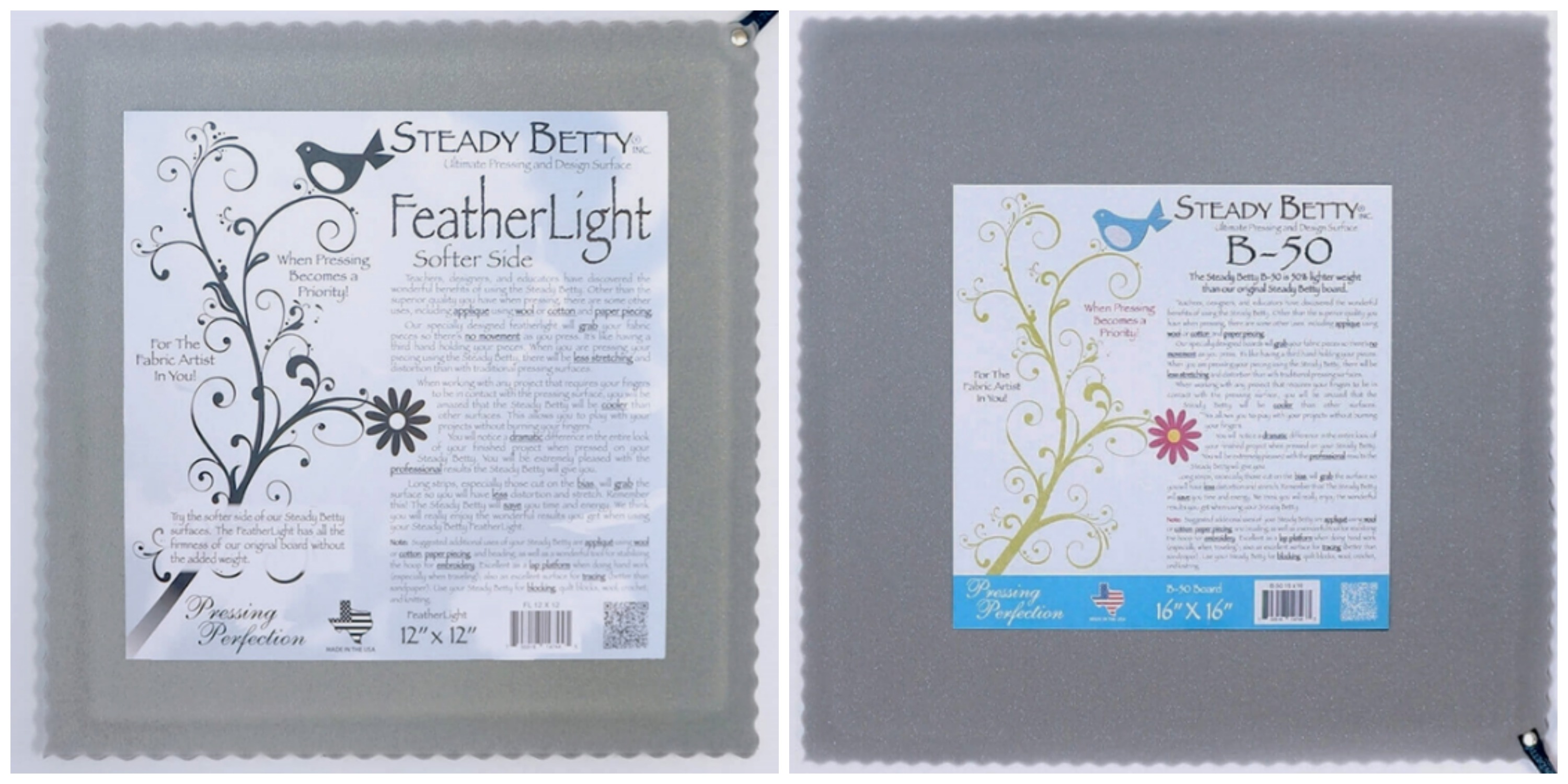 A Steady Betty holds your pieces in place as you press them. It makes your seams more precise and gives a better finish to your quilt. New at TQS is the larger board which has a 15" x 24" pressing surface and is perfect for pressing larger pieces or as an ironing board replacement. The B-50 has a 16" x 16" pressing surface and a light board in it for stability. The FeatherLight is perfect for retreats or classes with a 12" x 12" pressing surface and an extra-lightweight, flexible core.