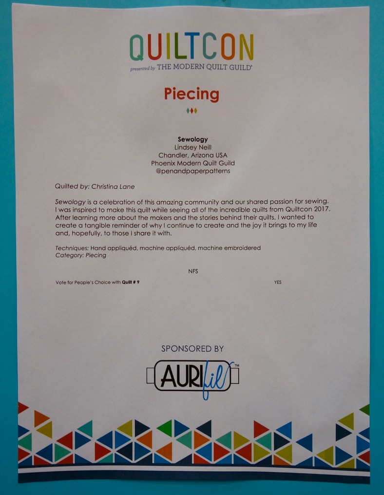 When Lindsey Neill visited QuiltCon 2017 she was inspired by all of the incredible quilts. As she learned more about the makers, she decided she wanted to create a reminder of why she continues to create and the joy that creating brings to her life. Her quilt, "Sewology" is her testament to the quilting community and their shared passion for sewing. It was exhibited at QuiltCon 2018.