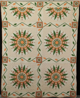 If this quilt looks familiar it is because another made by Sally Beaird Lewellin is on the cover of the book, LoneStars, A Legacy of Texas Quilts, 1836-1936, the quilt documentation conducted by Karoline Patterson Bresenhan and Nancy O’Bryant Puentes. A paper on this pattern was given at the fall 2017 American Quilt Study Group Seminar that documented the unusual pattern to the Georgia/Tennessee border where Sally was raised. Jackie’s donation remains the only one of Sally Beaird Lewellin’s quilts to be in a public museum available for all to study and see.