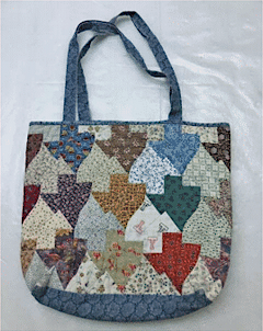 As evidenced by her pattern company, Jackie enjoyed creating block patterns. Her children recall that after seeing the Texas shaped sidewalk-paving bricks outside a quilt shop in Lewisville, TX she went home and worked for 10 hours until she successfully drafted Texas Tessellations so it could be pieced without using inset pieces. Below is a tote bag she made from this pattern, which she used while teaching quilting.