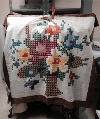 Mrs. Reis was also an avid student of quilt history and attended inductions at the Quilters Hall of Fame in Marion, Indiana where she met several of the Honorees. The Flower Basket Petit quilt made by Grace Snyder based on a china pattern enchanted her. Jackie made a quilt top that is a small size version of the Grace’s quilt and donated it along with pieces of the china on which it was based. The family also donated books from her quilt history research collection to the Clothing and Textiles Research Library of the Museum.