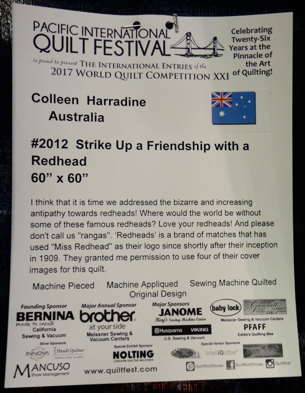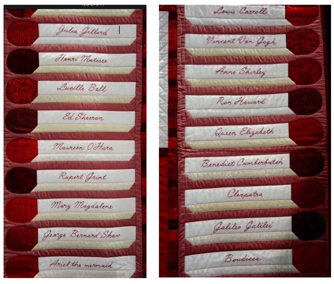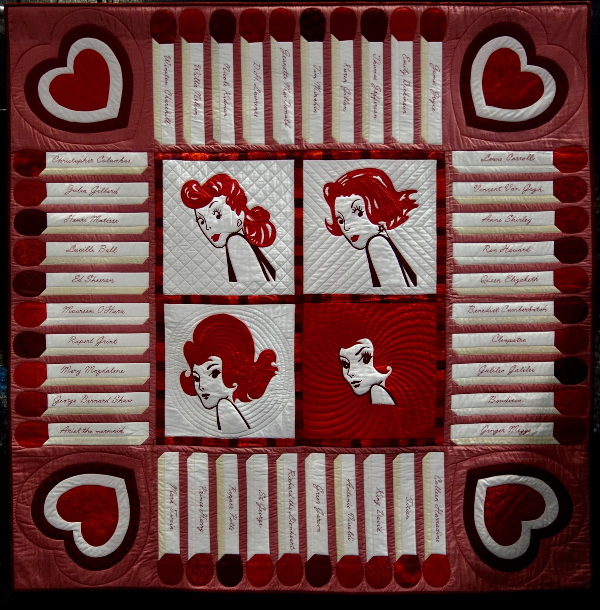 Colleen Harradine does and she made a quilt to prove it. Strike Up a Friendship with a Redhead is Colleen's way of addressing as she puts it, "the bizarre and increasing antipathy towards redheads!" In her quilt she lovingly highlights many famous redheads throughout history. Did she miss anyone?
