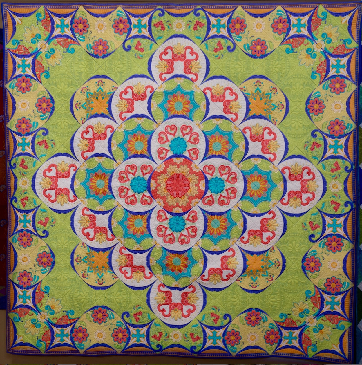 This gorgeous quilt, Sewn Seeds, is another collaboration between The Hoop Sisters and Sharon Schamber (Show 1603). It is a former 2015 EmboridaBlock of the Month.