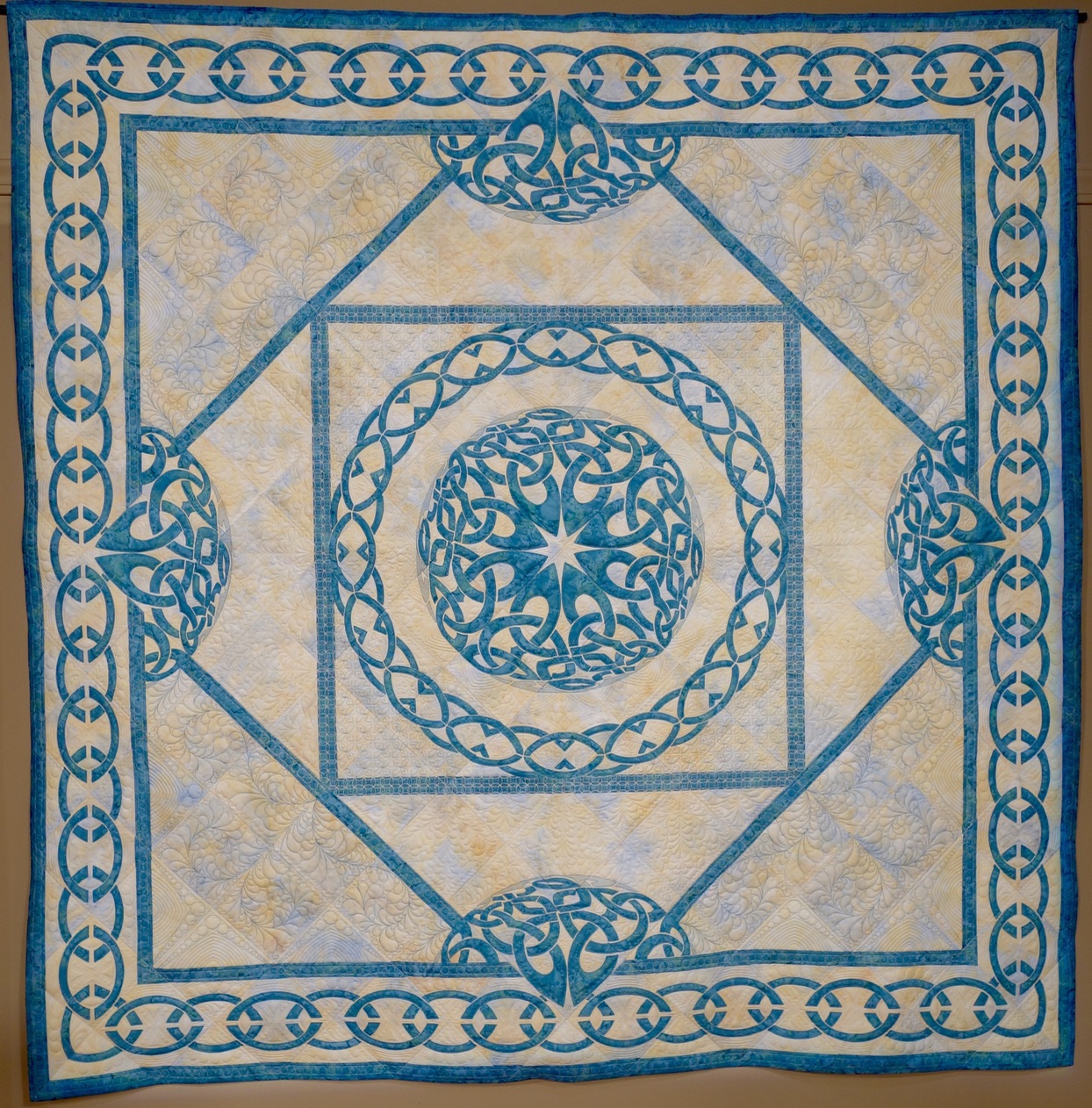 This spectacular two-color quilt, Sisterhood, is The Hoop Sisters 2018 EmbroidaBlock of the Month.