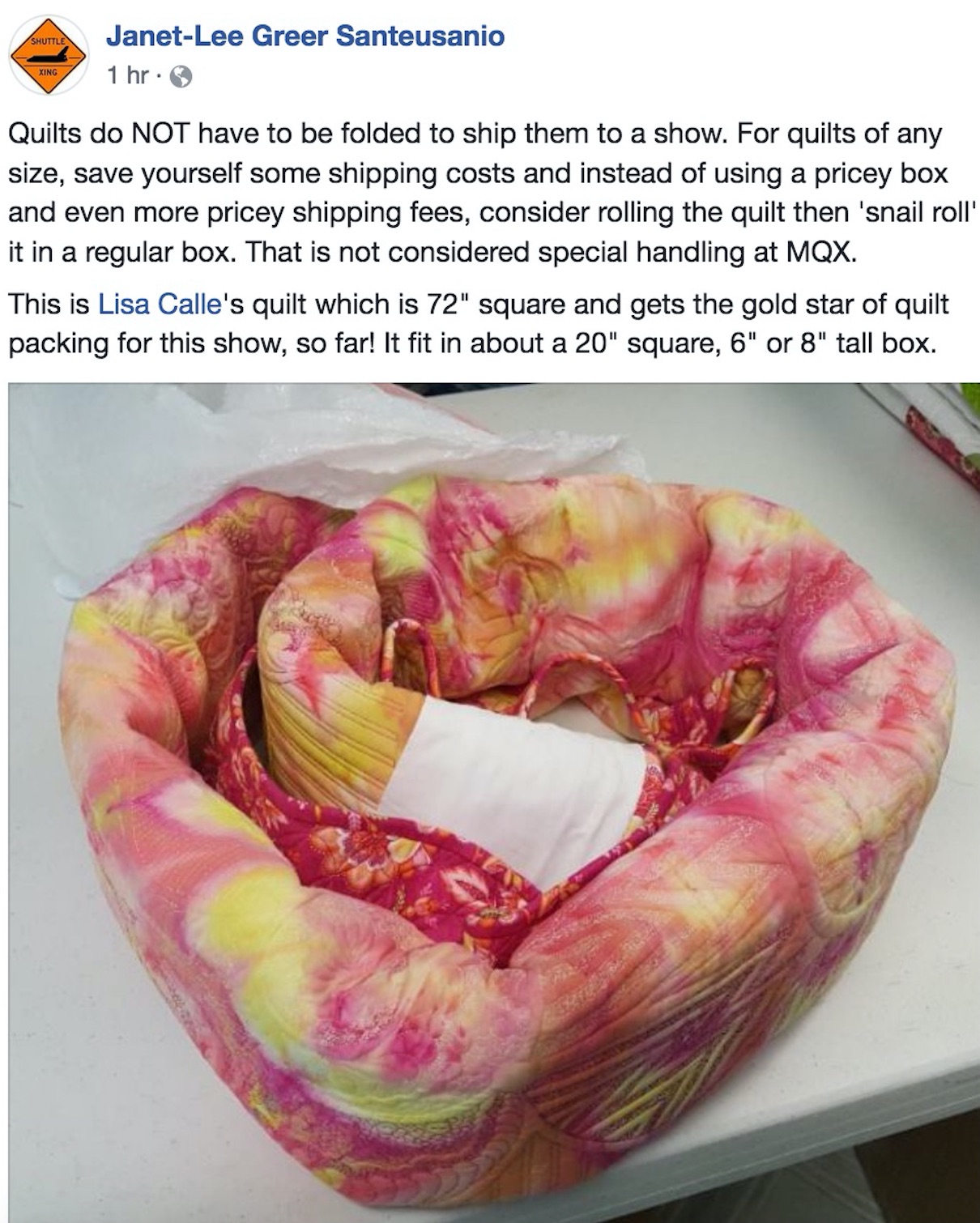 The cost of shipping quilts to a show is getting to be quite a topic. Janet-Lee Santeusanio is one of the founders of the MQX Festivals. She is also the vendor, sponsor, and quilt show manager. So, when she recently posted how to pack a quilt for a show, we took notice. We also noticed it was packed by award-winning quilter and TQS guest, Lisa Calle.